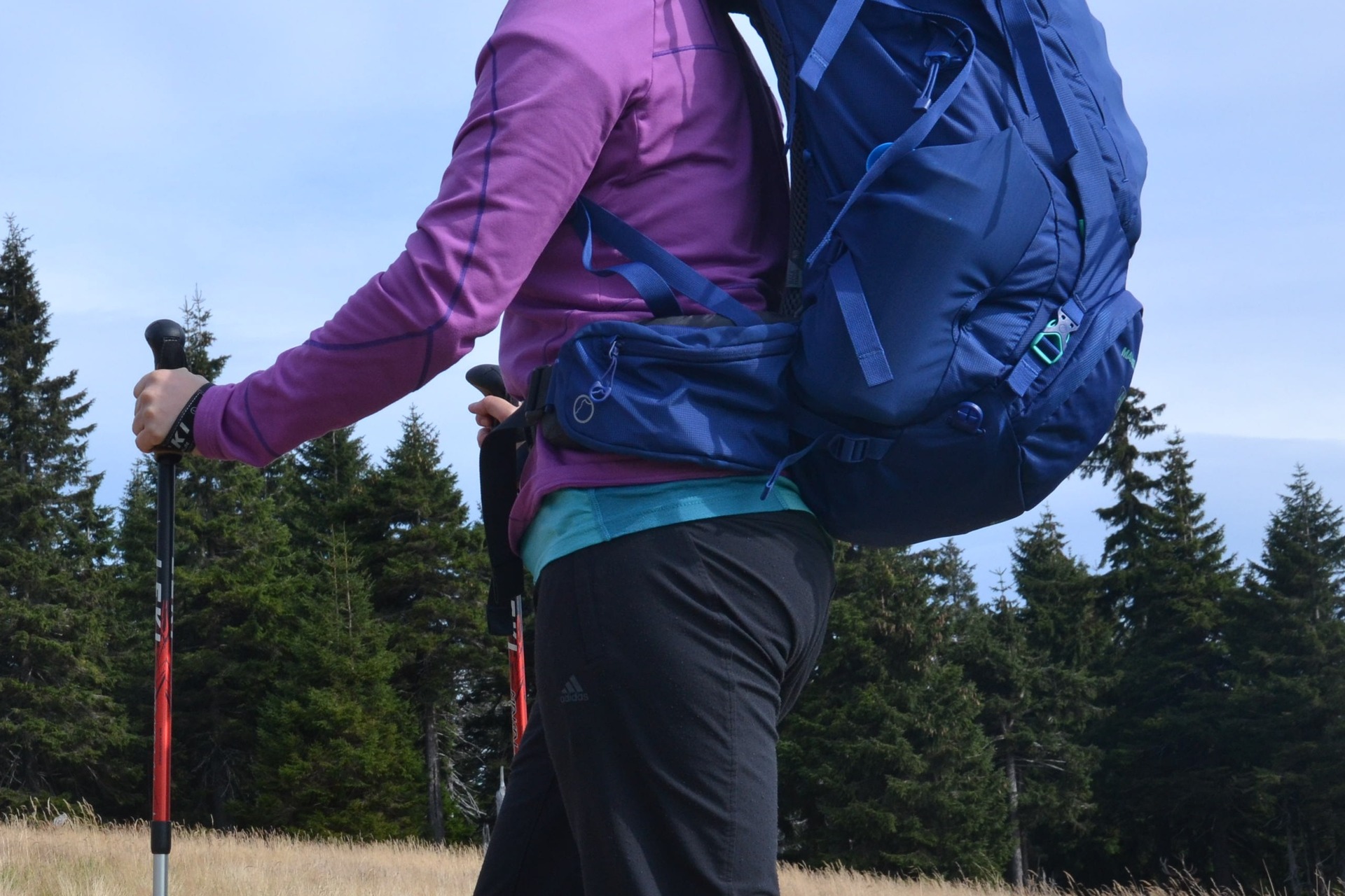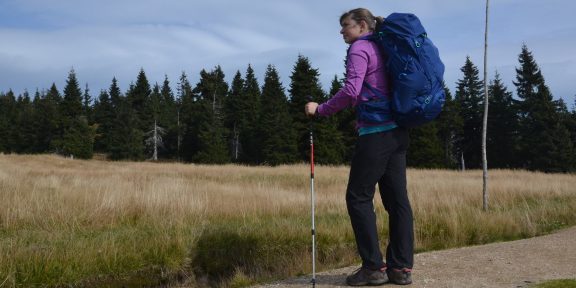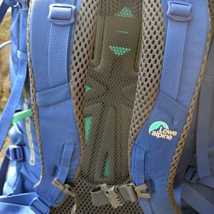 Bederní pás se dvěma postranními kapsičkami je poměrně mohutný a chvíli mi trvalo si na něj zvyknout. Dá se přitáhnout z obou stran a rozložit tak zátěž rovnoměrně. Široké polstrované ramenní popruhy fixuje na místě nastavitelný a odnímatelný hrudní pás s píšťalkou. Díky konstrukci uzpůsobené drobnější ženské postavě mi batoh pohodlně sednul na záda a dobře se nosil i plný např. při výšlapu v Krkonoších.