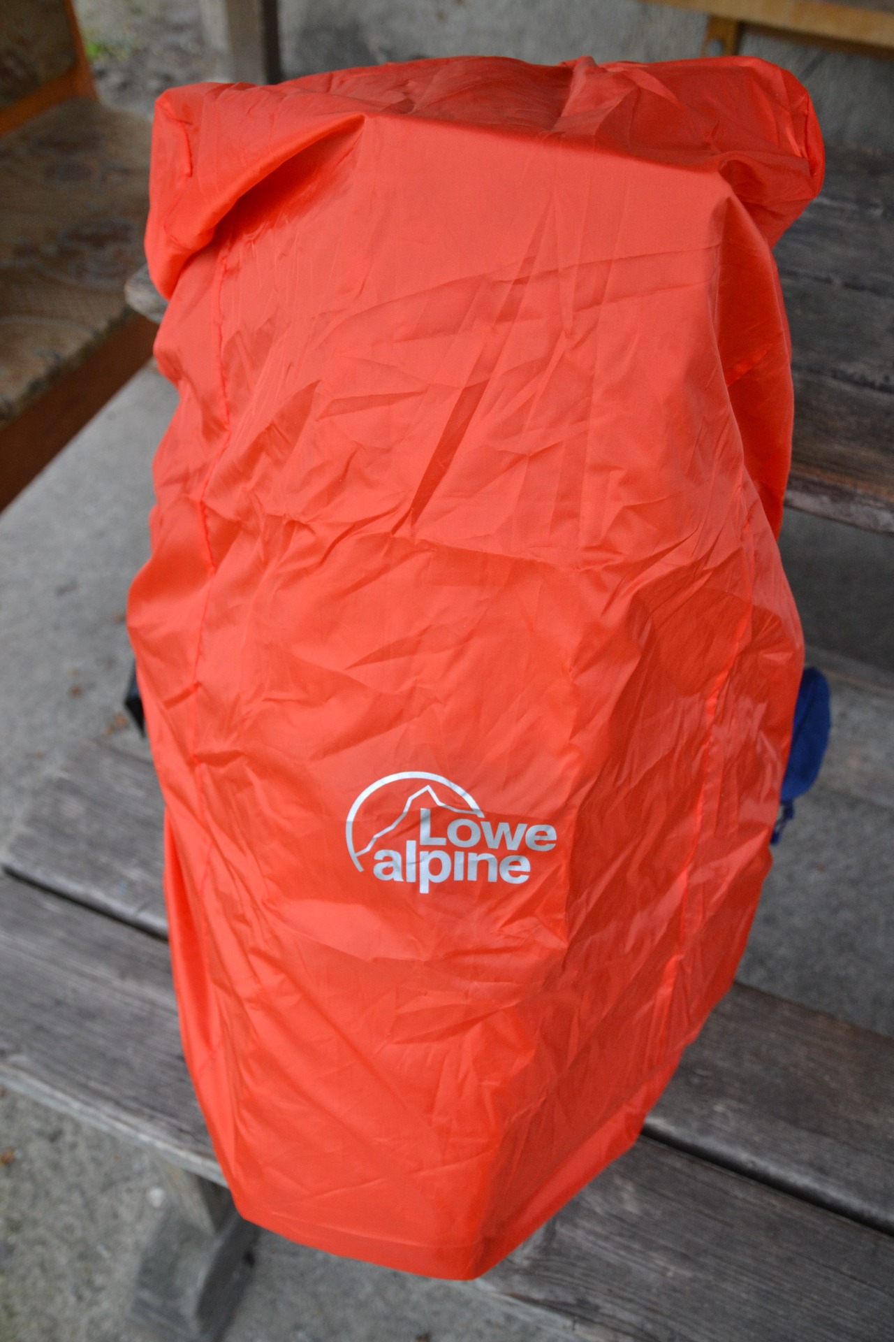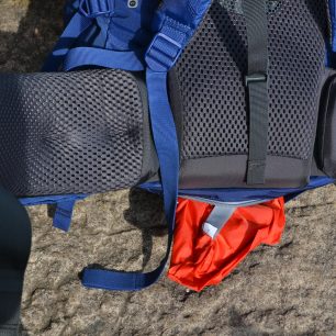 Na dně batohu najdeme kapsu na zip, ukrývající svítivě červenou integrovanou pláštěnku, která je dost velká, aby schovala např. i karimatku přidělanou vně batohu.