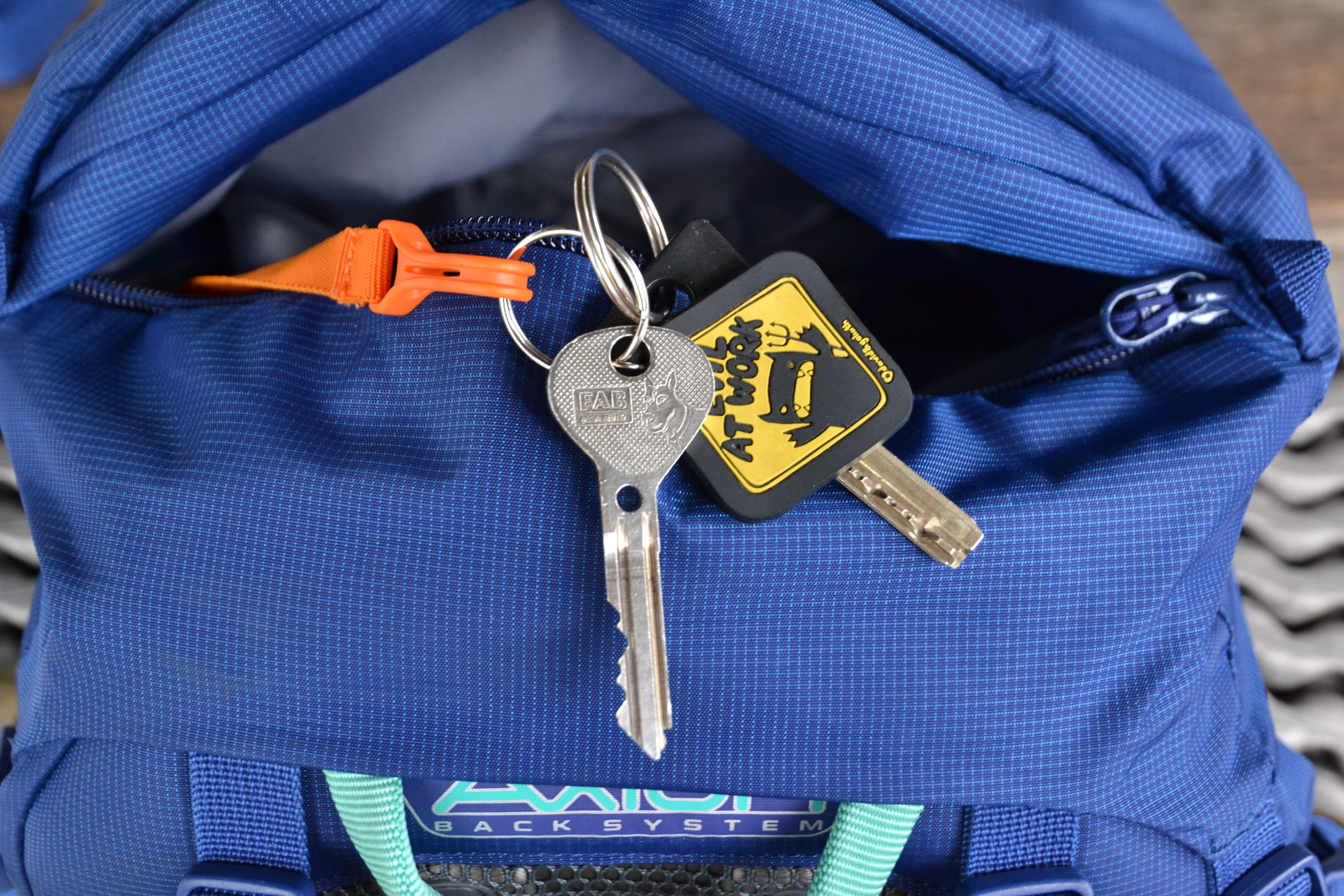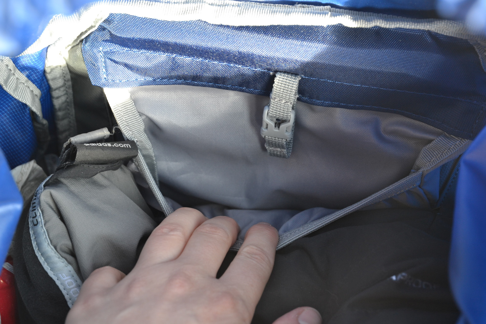 Ve vrchní kapse víka najdeme praktickou klíčenku. Nechybí ani již zmíněná píšťalka na hrudním popruhu a návod pro nouzovou signalizaci, natištěný na vnitřní straně víka. Pro snadnější manipulaci je batoh opatřený madlem nejen nad zády, ale i v přední části.