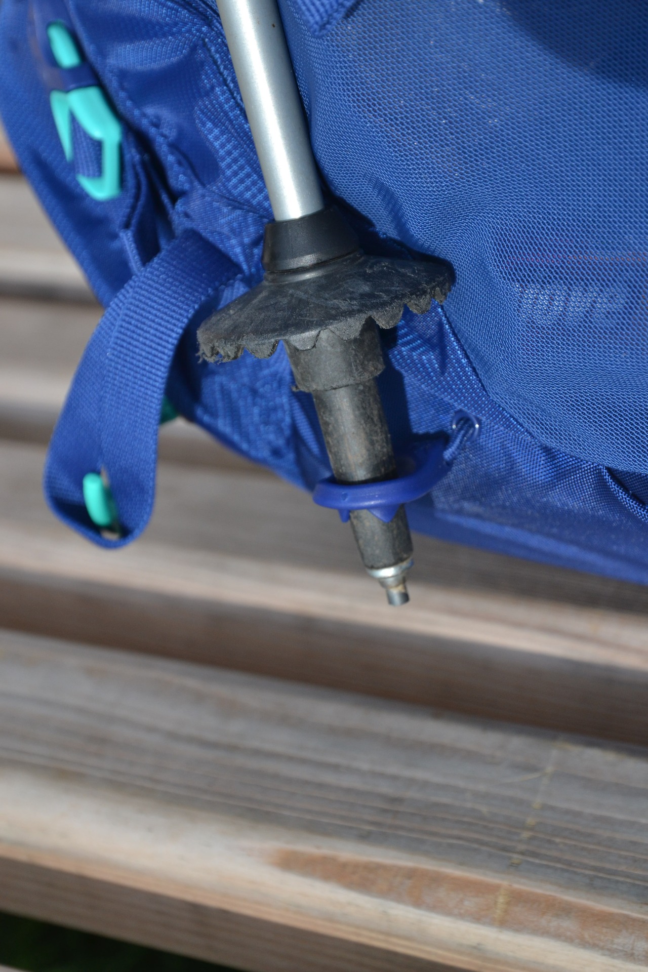 Gumička se svorkou drží vrchní část hole. Díky háčku se dá gumička snadno uvolnit a hůl vyháknout.