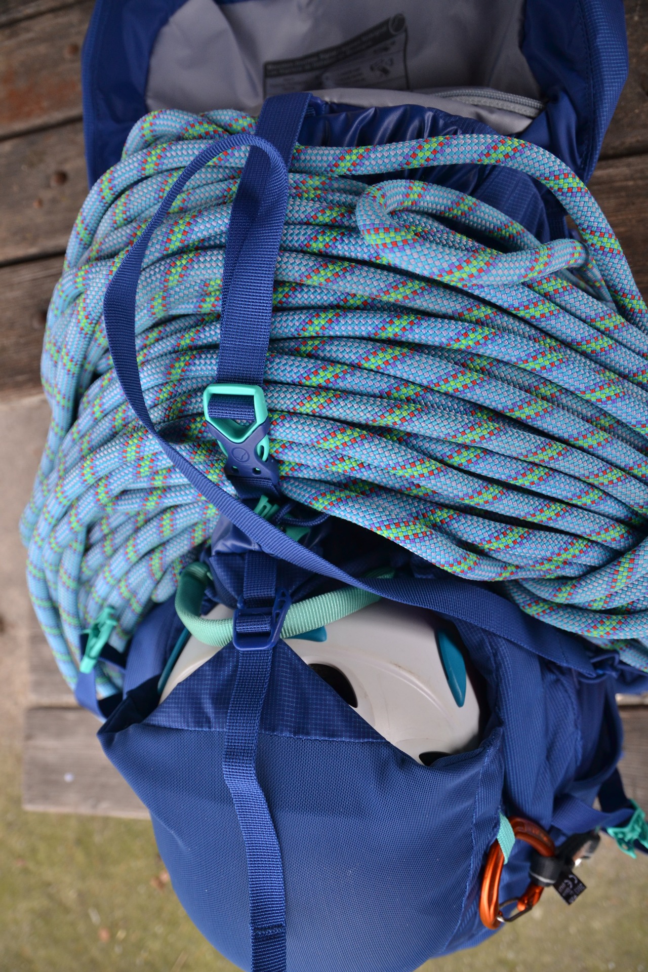 Zabaleno na hory, optimální místo pro helmu, lano i další materiál.