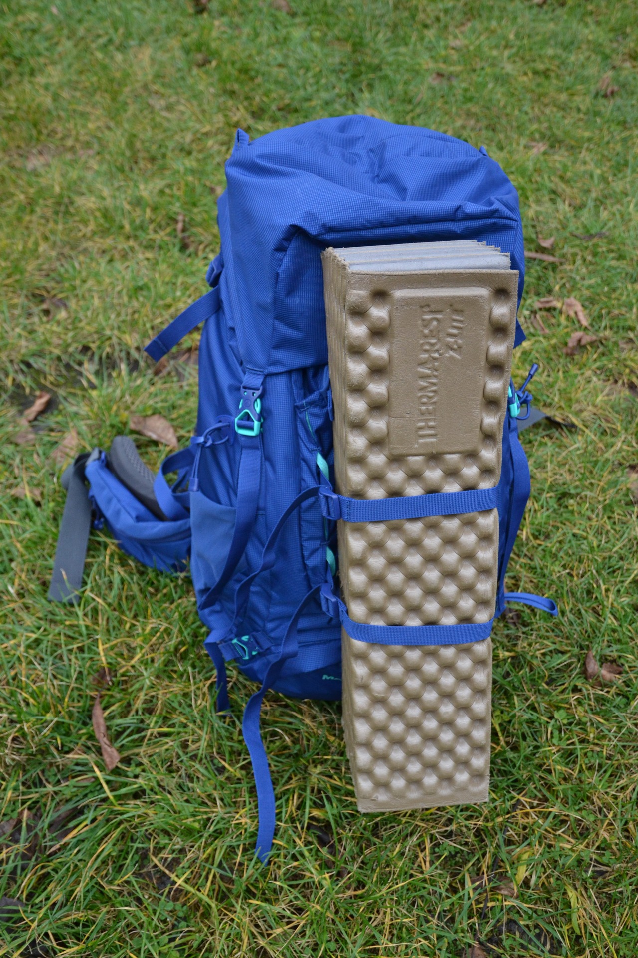 Uchycení karimatky pomocí přídavných popruhů a extra oček na materiál.