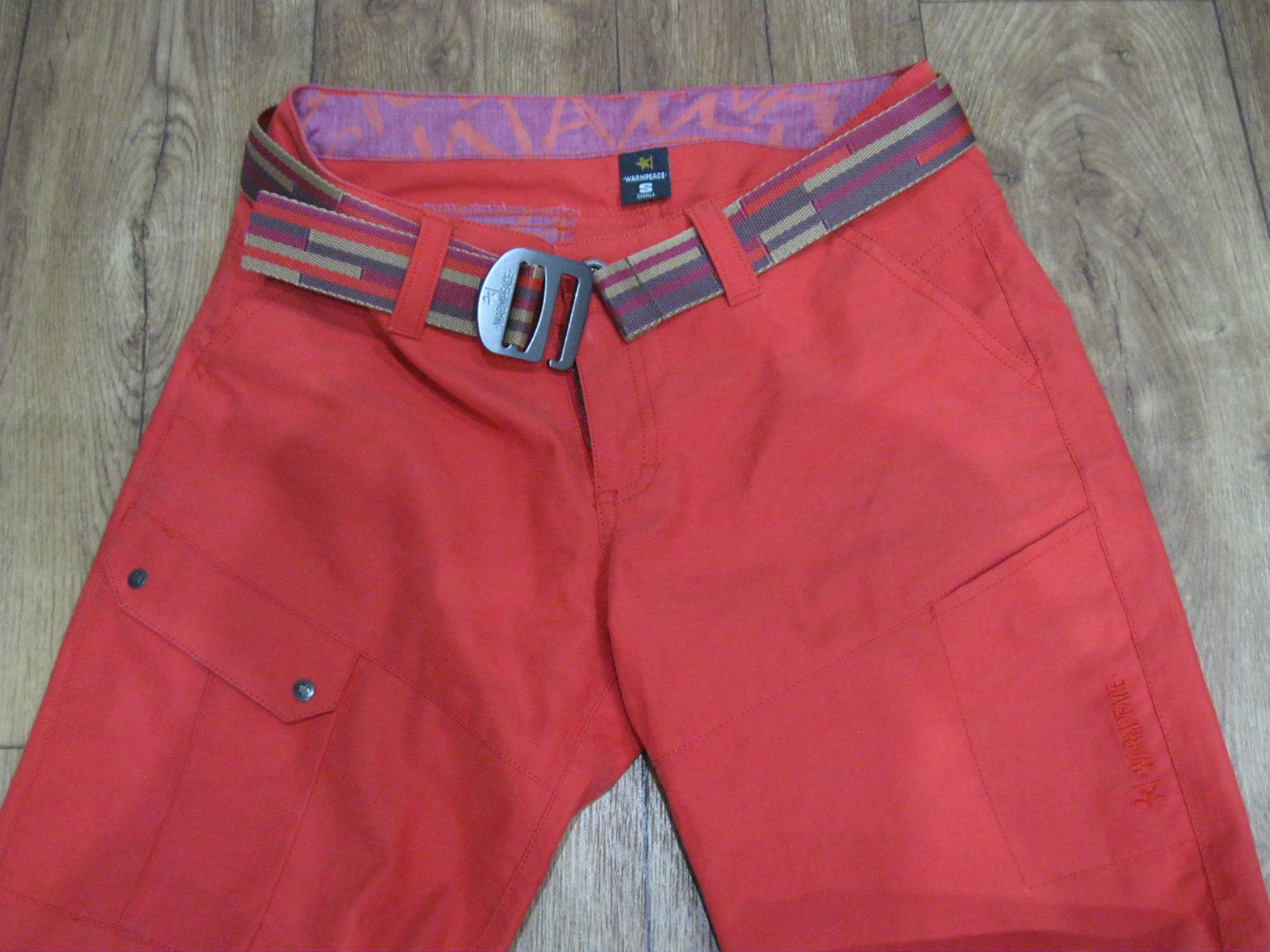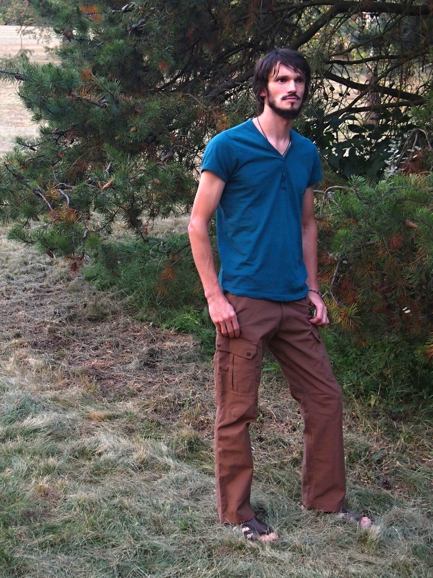Kalhoty mají klasicky rovný střih. Na zadku mají dvě otevřené kapsy. I když ta pravá je vlastně zdvojená. Na první pohled nic nepoznáte, ale je zde všitá tajná dostatečně hluboká kapsa na zip. Klasické kapsy jsou i zepředu. Pravá má i malou všitou kapsičku. Jak se říkalo dříve, na hodinky. Na pravém stehnu zepředu je poměrně velká kapsa na dva cvočky. Na levém stehnu je delší, méně široká a bez zapínání. Střih je příjemně bokový doplněn o nastavitelný pásek se zajímavou sponou. Samotné zapínání kalhot je pomocí zipu a nad ním cvočku. Sešití na kolenou umožňuje volný pohyb.