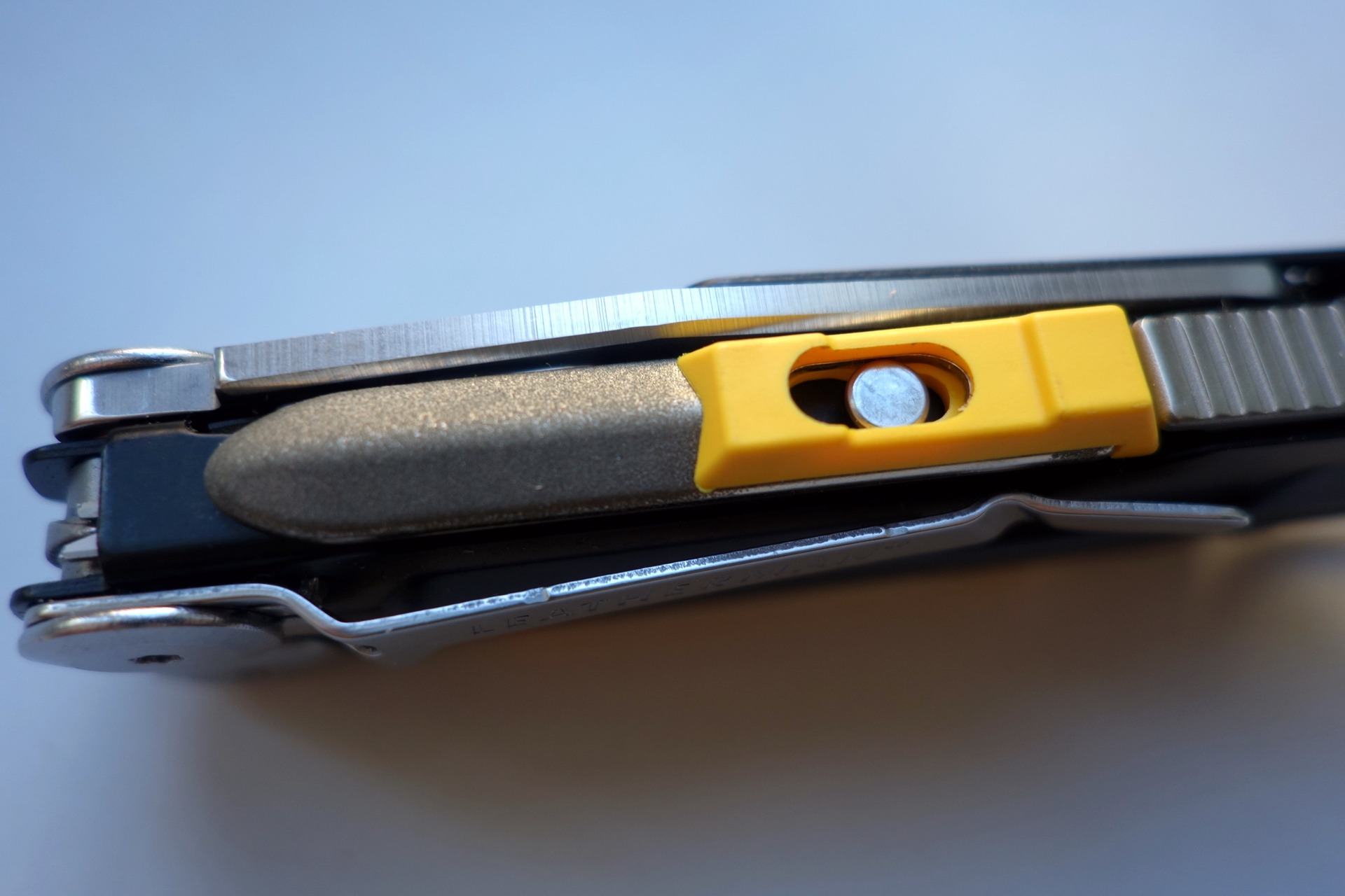 Dokonce jsou tu dvě dost neobvyklé pojistky. Jedna uzavírá celý multitool, aby se rukojeti od sebe nevyklápěly nechtěně a docela mě zaujala speciální a nikde neinzerovaná automatická pojistka proti otevření čepele samotného nože při rozevřených kleštích (aby nedošlo k náhodnému pootevření a možnému zranění o ostří nože – chvíli jsem nemohl přijít na to, k čemu je nezvyklý výstupek, až jsem zjistil, že automaticky vyjíždí do dráhy otevírání čepele nože, když se otevírají kleště).