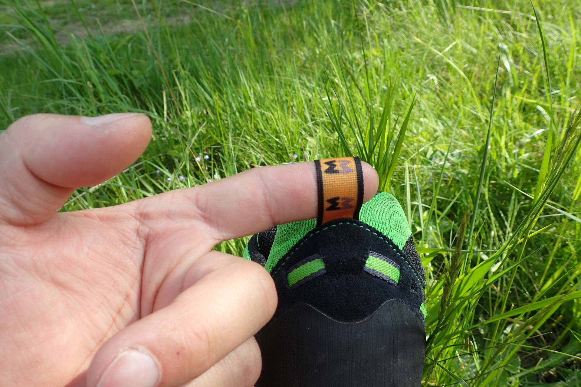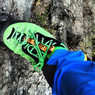 Přes patu je šněrování spojeno pomocí popruhu a fixuje tak i tuto patní část. V případě, že opravdu počítáte s tím, že budete stát na malých stupech nebo chcete mít při lezení v botě jisto či „těsno“, můžete si zatáhnout tkaničky tak, že se vám přes patu ještě více stáhnou a to díky protaženému úzkému popruhu přes patu. Je třeba tomu trochu pomoct a zabrat. Dobře zatažená pata také zabraňuje vzniku puchýřů. Ploché tkaničky docela dobře drží i bez pojistného uzlu. Ten však na všechny lezecké aktivity doporučuji udělat.