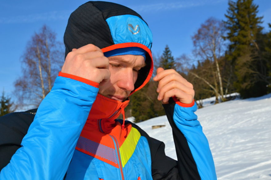 Kapuce je pojata jednoduše až minimalisticky, nemá žádné stahování a její velikost a anatomické tvarování ji předurčuje k nošení pod helmou, což je vzhledem k charakteru bundy dobře. Pokud totiž fouká (nebo sněží) opravdu hodně, přijde stejně na řadu vrchní „gore“ bunda, obvykle s kapucí přes helmu. Jemné vnitřní zateplení kapuce příjemně zvyšuje tepelný komfort.
