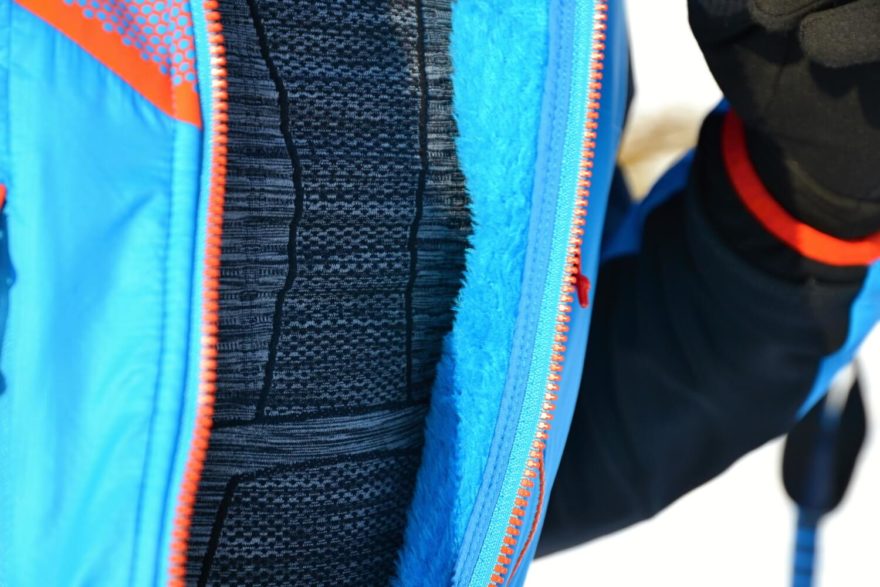 Límec je lehce vyvýšený, při úplném zapnutí tak pohodlně chrání krk a bradu. Materiál (Blizzard® Thermal), ze kterého je vnitřek límce je na dotek příjemný, navíc překrývá i horní centimetry zipu, takže nikde nic neškrábe.