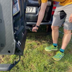 Možnost dostat se do zavazadlového prostoru i s naloženými koly je myslím jeden ze základních požadavků většiny uživatelů a Thule Epos to samozřejmě umožňuje. Opět je to velmi jednoduché, stačí sešlápnout „pedál“ zespodu nosiče a ten se sklopí do velkého úhlu, přístup do kufru je pak dostatečně pohodlný. Sklopený nosič bezpečně drží na ocelovém lanku, po jeho narovnání se sám zaaretuje slyšitelným „cvaknutím“