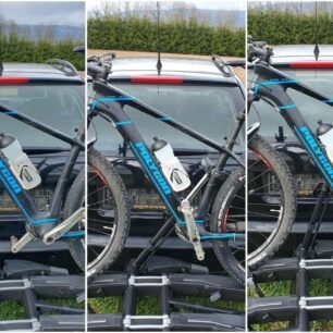 Samotné uchycení rámu zajišťuje pogumovaná hlavice s páskem a ráčnou, kolo lze bez problému uchytit za horní, spodní i svislou rámovou trubku, podle toho, jak se to zrovna hodí vzhledem k převáženým kolům. Mezi jednotlivými ližinami je rozestup cca 25 cm, což mi připadalo tak akorát, kola je samozřejmě dobré nakládat s řídítky na opačných stranách, občas bylo potřeba zasunout sedlo, jinak se kola vedle sebe vešla vždy dobře. Za jízdy držela kola bez problému a bezpečně, ale to je u této renomované značky myslím už tak nějak samozřejmé 😊.