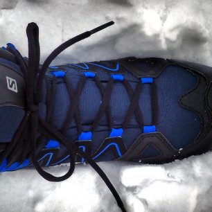 Salomon Cruzano GTX mají šněrování procházejicí pěti textilními očky a jedním háčkem.