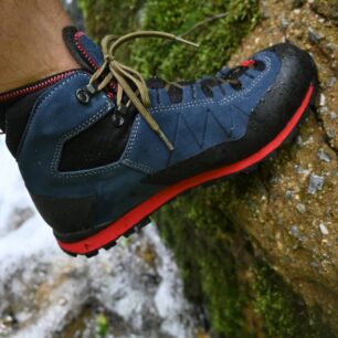 Na první pohled kompaktní a designově pěkně vymyšlené boty. Podrážka je značková s hrubým vzorkem a s lezeckou špičkou. Šněrování pomocí 4 párů oček a 2 párů háčků. Špička a pata jsou chráněny gumovou obsázkou.
