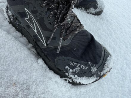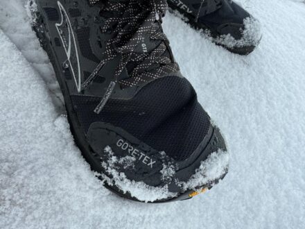 Stejně jako u základní verze bez GTX musíme vyzdvihnout rozšířený gumový okop v přední části boty, který dobře chrání jak botu samotnou, tak i prsty na nohou. Díky tomu je bota použitelná v kamenitějších terénech, i když rozhodně nečekej tvrdou obsázku jako na trekových botách. Ocenit lze i další maličkosti jako pohodlný vypolstrovaný jazyk a jednoduché ploché tkaničky, které dávají prostor pro různé typy šněrování a hlavně dobře drží. Naší oblíbenou vychytávkou je tzv. gaiter trap na uchycení návleku v patní části. Zejména v zimních či blátivých podmínkách považujeme návlek za nutnost – ten od Altry sice není nepromokavý, ale i v zimě zabrání padání sněhu do bot a jejich rychlému promáčení seshora.