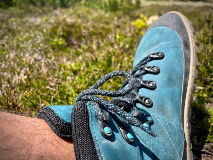 Boty disponují sedmi otvory pro tkaničky (4 očka + 3 háčky). Háčky mají chytrý systém, který zabraňuje povolování. Za mě je toto řešení velmi intuitivní a efektivní. Tkaničky jsou kulaté a poddajné. Délka je dostatečná i pro uvázání pojišťovacího uzlu (během testování nebyl potřeba). Při běžném pohybu nemám rád moc dotažené boty — Aylla Mitu i v utažení „hala bala” fungují na výbornou a nezouvají se. V oblasti paty se nachází tradiční poutko, které usnadňuje nazouvání a může posloužit i k zavěšení bot například na sedák (i když tyto boty už na sedáku celkem ucítíte). Na jazyku poutko usnadňující obouvání chybí.