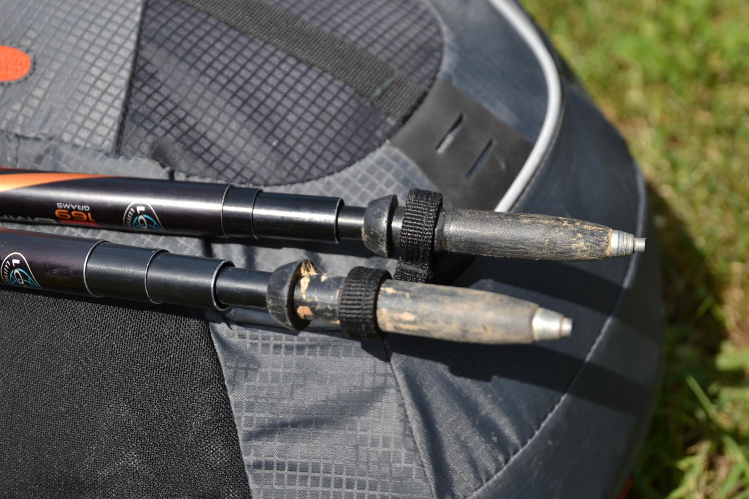 Batoh má poutko na cepín a hole a gumičku se stahováním pro připevnění rukojeti. Poutko má jedno větší oko na cepín a dvě menší na hroty holí. Drobnou vadou je, že gumička v horní části mi přišla trochu krátká pro přichycení obou holí. Možná to bylo tím, že čtyřdílné skládací hole jsou o něco tlustší než třídílné.