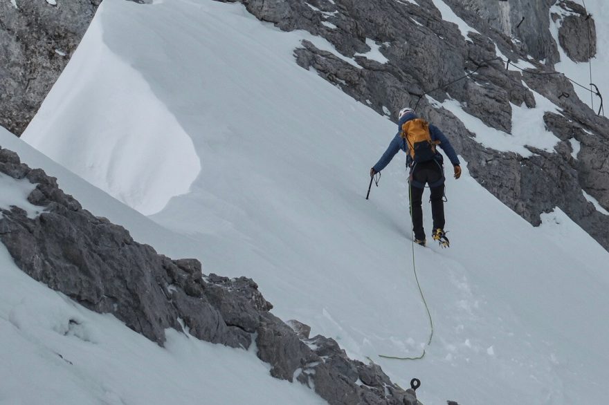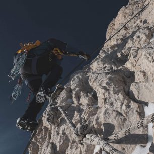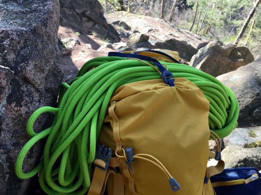 Už při prvním balení materiálu do hor jsem věděl, že si s Guidem 34+ budeme rozumět. Velikost je pro mě tak akorát, abych s ním dal libovolnou akci v horách, ideálně tedy se zázemím chaty. Pokud bych chtěl brát lezecký materiál a plánoval bych spaní ve stanu, volil bych větší variantu. Materiál jsem upínal následujícím způsobem.