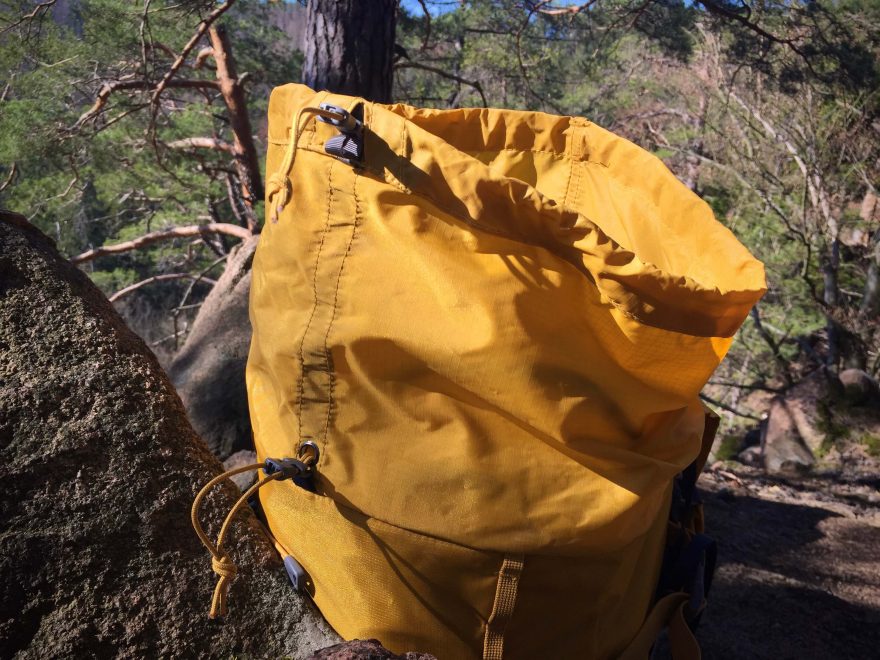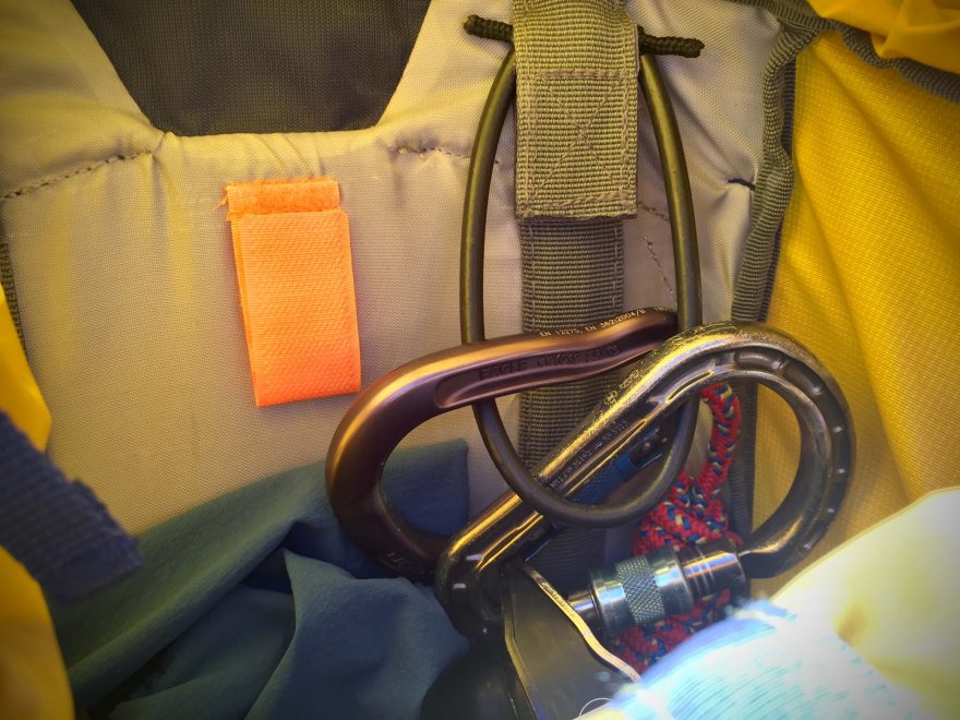 Snažím se mít lano vždy umístěné uvnitř batohu, ale občas prostě musí ven. Pásek pro jeho připevnění jsem využíval možná trochu jinak, než výrobce zamýšlel. V místě přišití stahování válce batohu je totiž miniaturní poutko, do kterého lze zasunout háček popruhu. Tento způsob jsem využíval jak pro připevnění lana, tak pro kompresi celého batohu. Když byl poloprázdný, vložil jsem celý vrchlík dovnitř a vše zajistil popruhem na lano Ten jsem protáhl ven otvorem pro vodní vak.