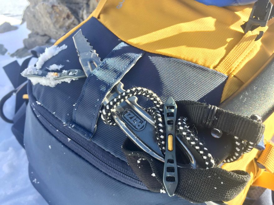 Oceňuji volbu provlékací destičky. Byl jsem schopen sundat cepín z batohu, aniž by batoh musel na zem. Krytí ostrého hrotu vyztuženým páskem je opět chytrým řešením. Zvolený způsob mi přijde pohodlnější než u předchozích verzí.