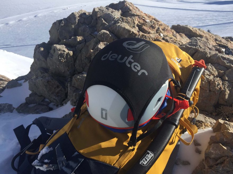 Při nástupech se snažím umístit helmu dovnitř batohu. Nejčastěji do ní vložím nepromokavou bundu a helmou uzavřu komín batohu. Pohodlnou možností je umístění helmy zvenku na batoh pomocí dodávané síťky. Háčky umístíte do oček svislých popruhů. Předchozí verze batohu Deuter Guide mívaly 4 poutka i na vrchlíku, bylo tak možné helmu umisťovat i sem. Těmito očky jsem provlékal gumičku, která sloužila pro uchycení bundy nebo mikiny. Poutka mi chybí, ale nejde o nic závažného (stejně mám helmu stále na hlavě. Potěší poutko na síťce na helmu, které zacvaknete do karabinky ve vnější kapse ve vrchlíku.