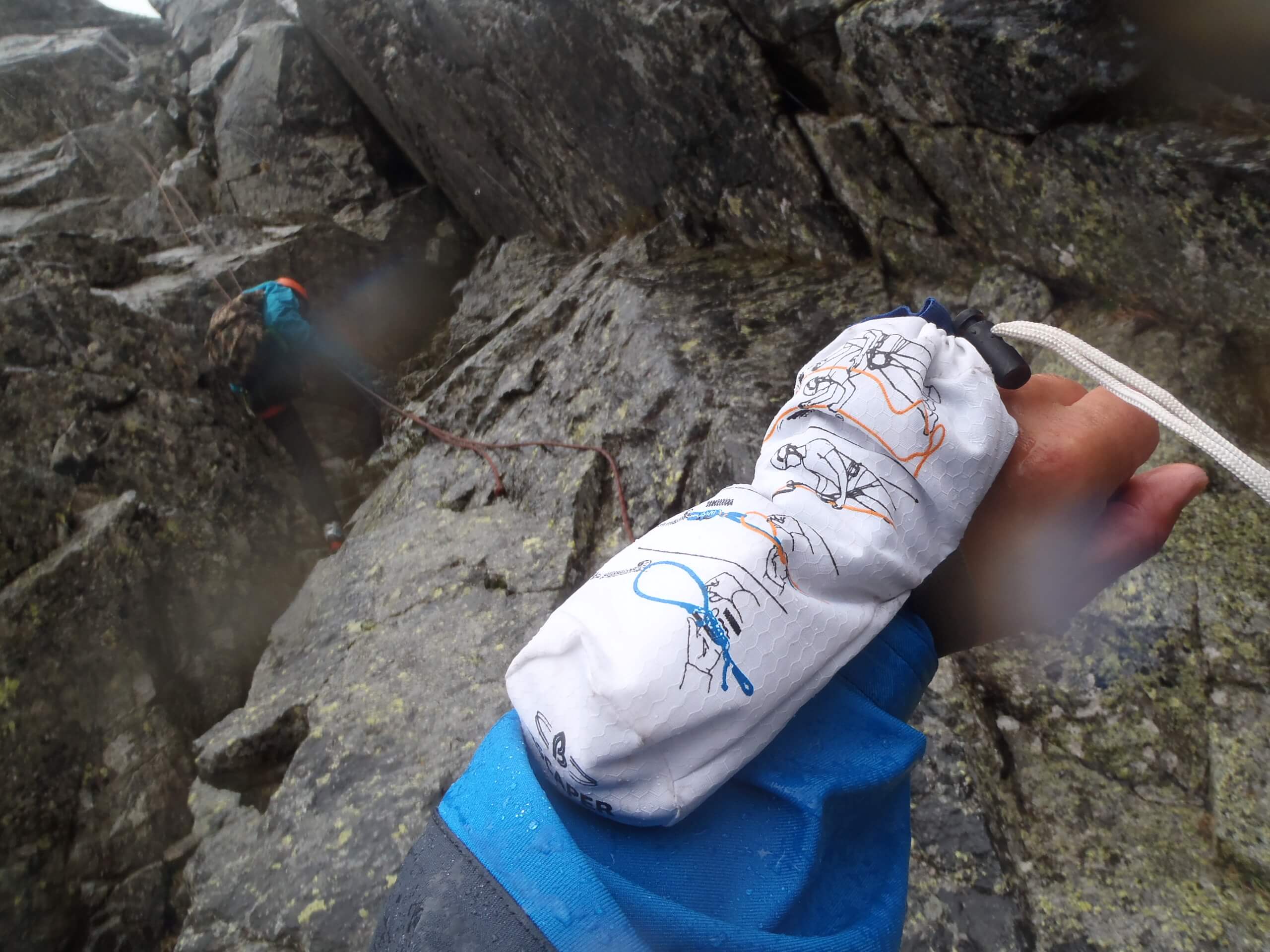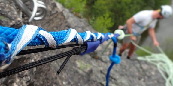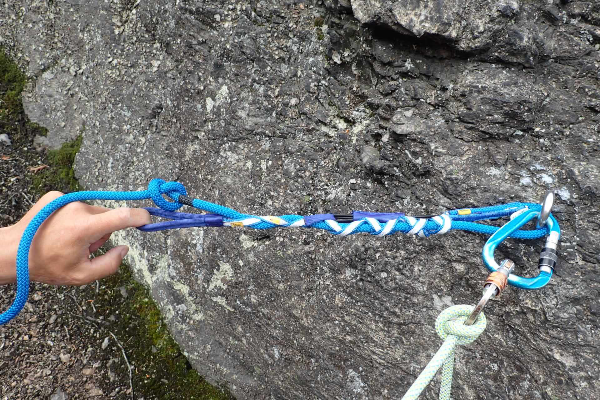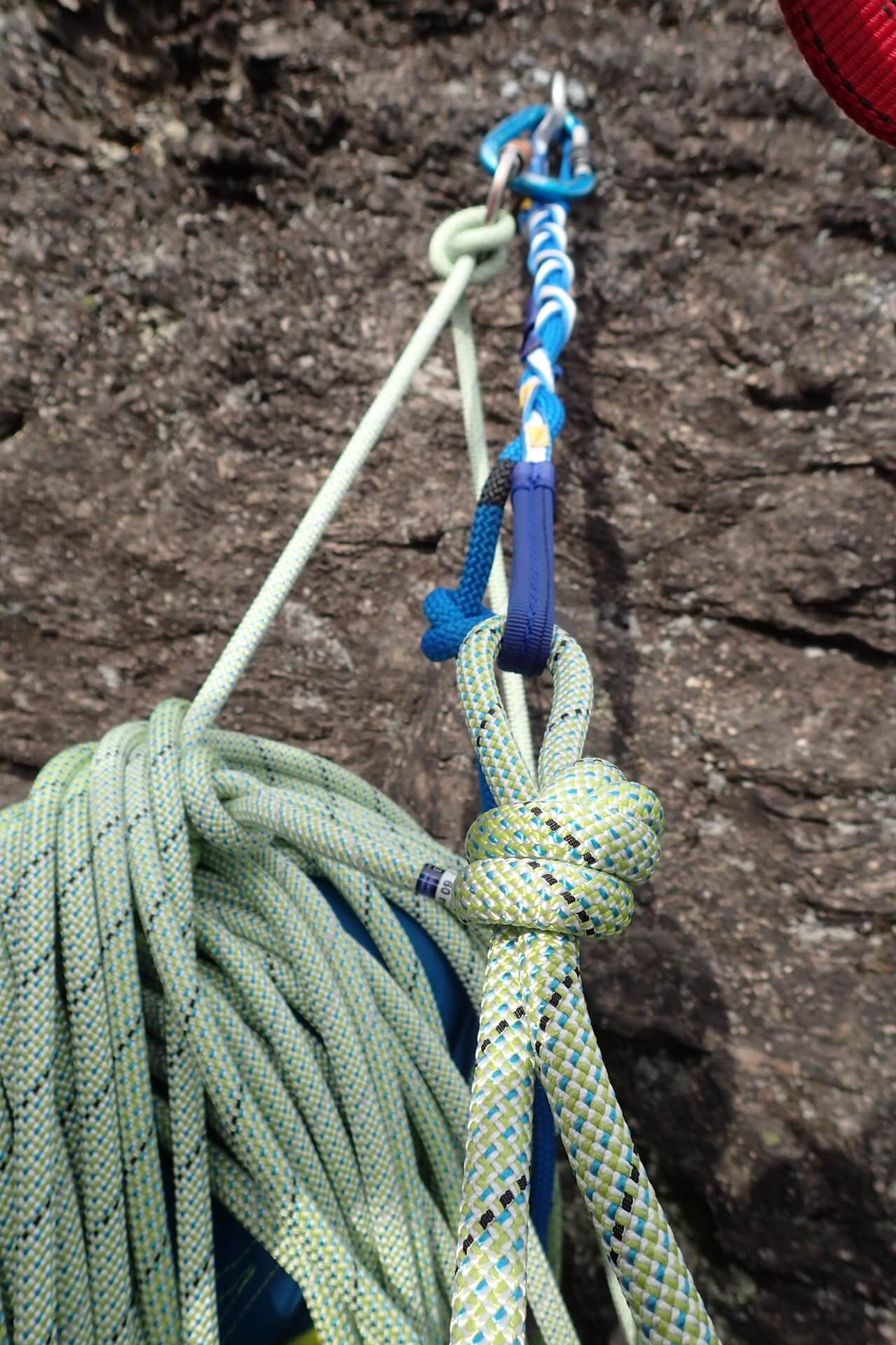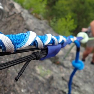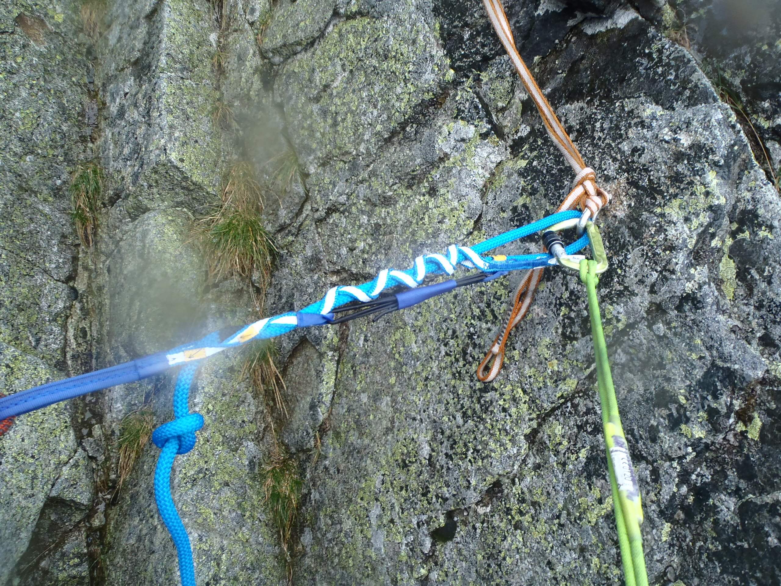 Nouzový slaňovací systém umožňující slanění na celé délce lana. Jak je to možné? Celé je to založeno na nápadu použít kus lana. To provléct dyneema popruhem, který připomíná tzv. „vánočku“ a na jeho konec přišít navazovací oko. A je to!
