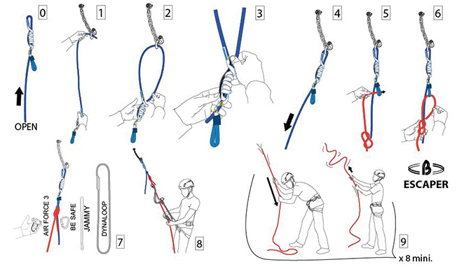 Veškerou manipulaci a testování Escaperu si nejprve vyzkoušejte na cvičné skalce nebo jen prostě na zemi. Takže? Obtočte „výtažné“ lano se ztenčeným koncem pro snadné provlékání, které je součástí Escaperu okolo jistícího bodu a provlékněte tuhý konec lana tunelem z dyneemové smyčky. Černé šipky na žlutých značkách vás navedou, kterým směrem máte provlékat. Až s provlékáním skončíte, utáhněte lano tak, aby černá značka na volném konci lana prošla tunelem celá. Do navazovacího oka uvažte lano na kterém hodláte slanit. Po slanění zatáhněte několikrát (minimálně 8x) za slaňovací lano, abyste systém uvolnili a poté rozvázali. POZOR: Aby se systém nezačal samovolně uvolňovat, je potřeba hlídat, aby byl stále zatížen minimálně 10 kg. Už jenom samotné lano při délce 60 m váží cca 3.5 kg. Systém je určen pro nouzové využití a nedoporučuje se jej používat jako náhrada za druhé či delší lano!