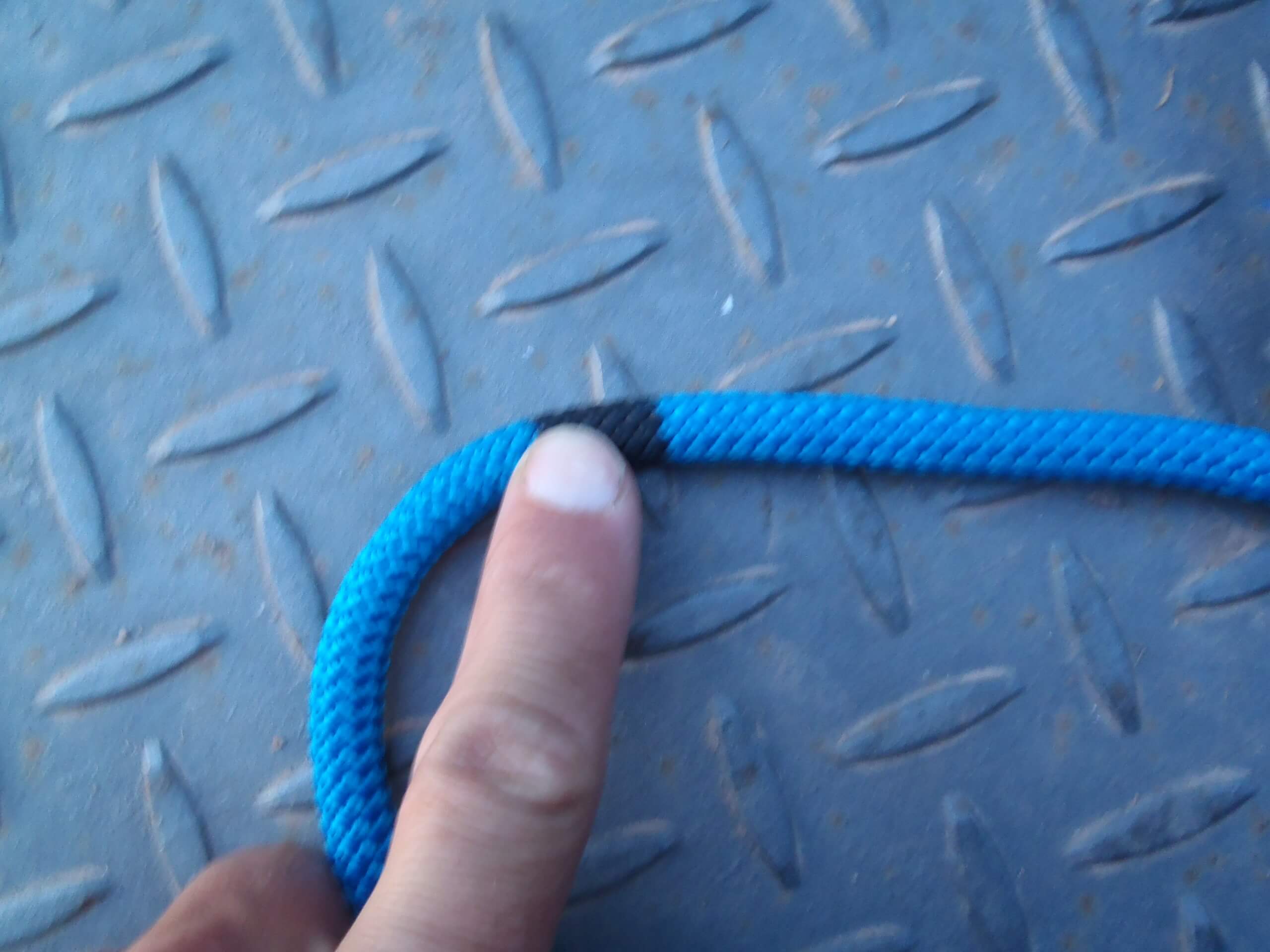Značka na výtažném laně znamená, že před slaněním nesmí dyneemový popruh být za totou značkou směrem k jeho konci.