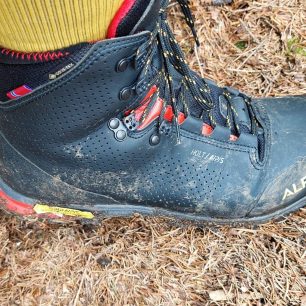 Tkaničky Alfa jsou impregnovány, což zabraňuje absorpci vody. Systém šněrování je kombinace poutek ve špičce a pak systém dvou párů zasekávacích háčku a průběžných háčků. Což je u trekové obuvi nezvyklé, ale na dvojí zasekávání jsem si zvykl a při experimentování jsem našel ideální sílu zatažení nohy v botě. Dvojice háčků přináší další variabilitu ve šněrování.