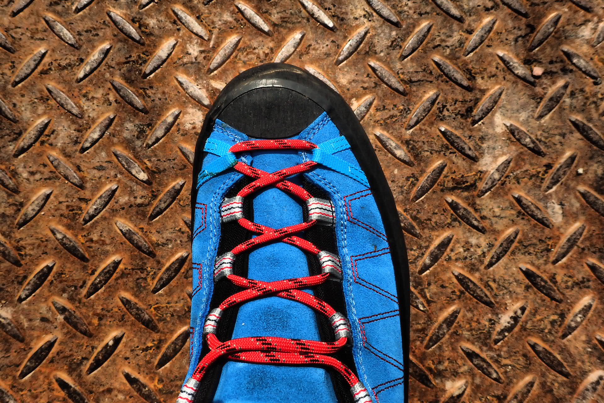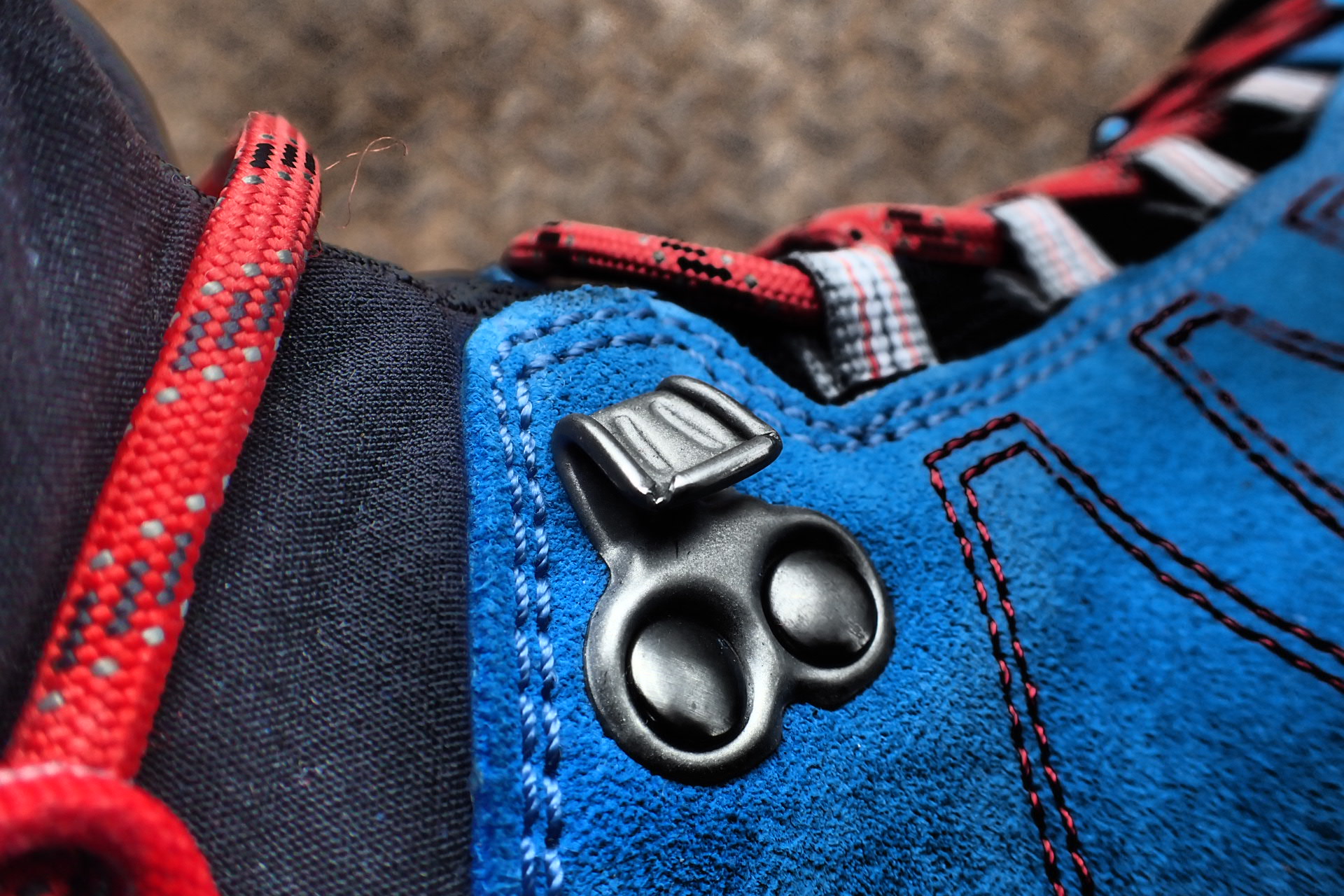 Šněrování je až do špičky boty. Tkaničky jsou kulaté a doporučuji po utažení bot udělat ještě pojistný uzel. Šňůrky jsou vedeny systémem pěti párů textilních poutek. Pak následuje dobře držící – klasický háček, který nepovolí zatažení špičky a nártové části. Dále pokračuje masivní textilní pár poutek, který dovoluje kvalitní zatažení patní části. Poslední dva páry háčků se starají o zatačení vršku boty. Jazyk je dobře polstrovaný a zavazování nijak netlačí.