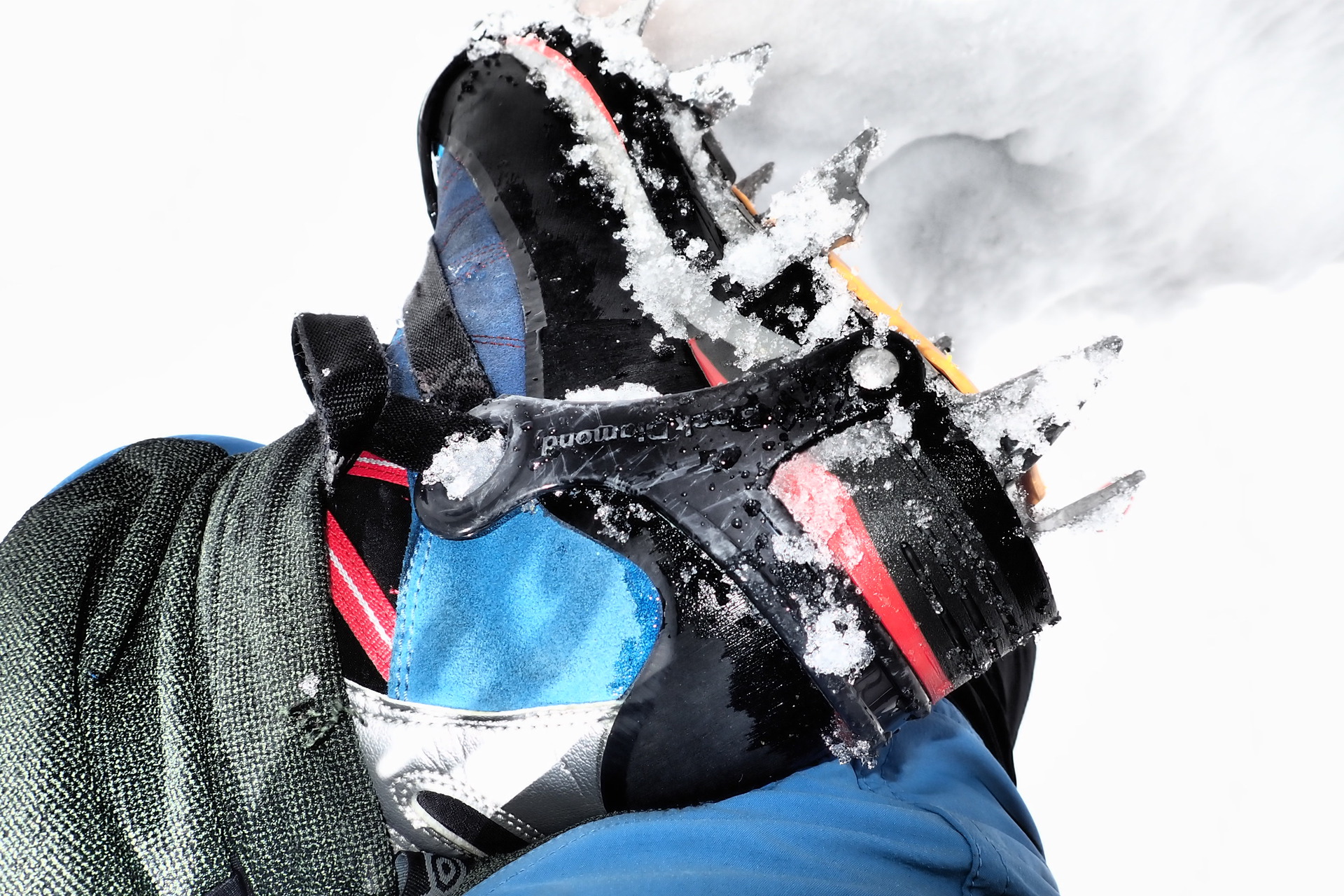 Nasazené poloautomatické mačky na botě ASOLO Elbrus GV – spodní pohled.