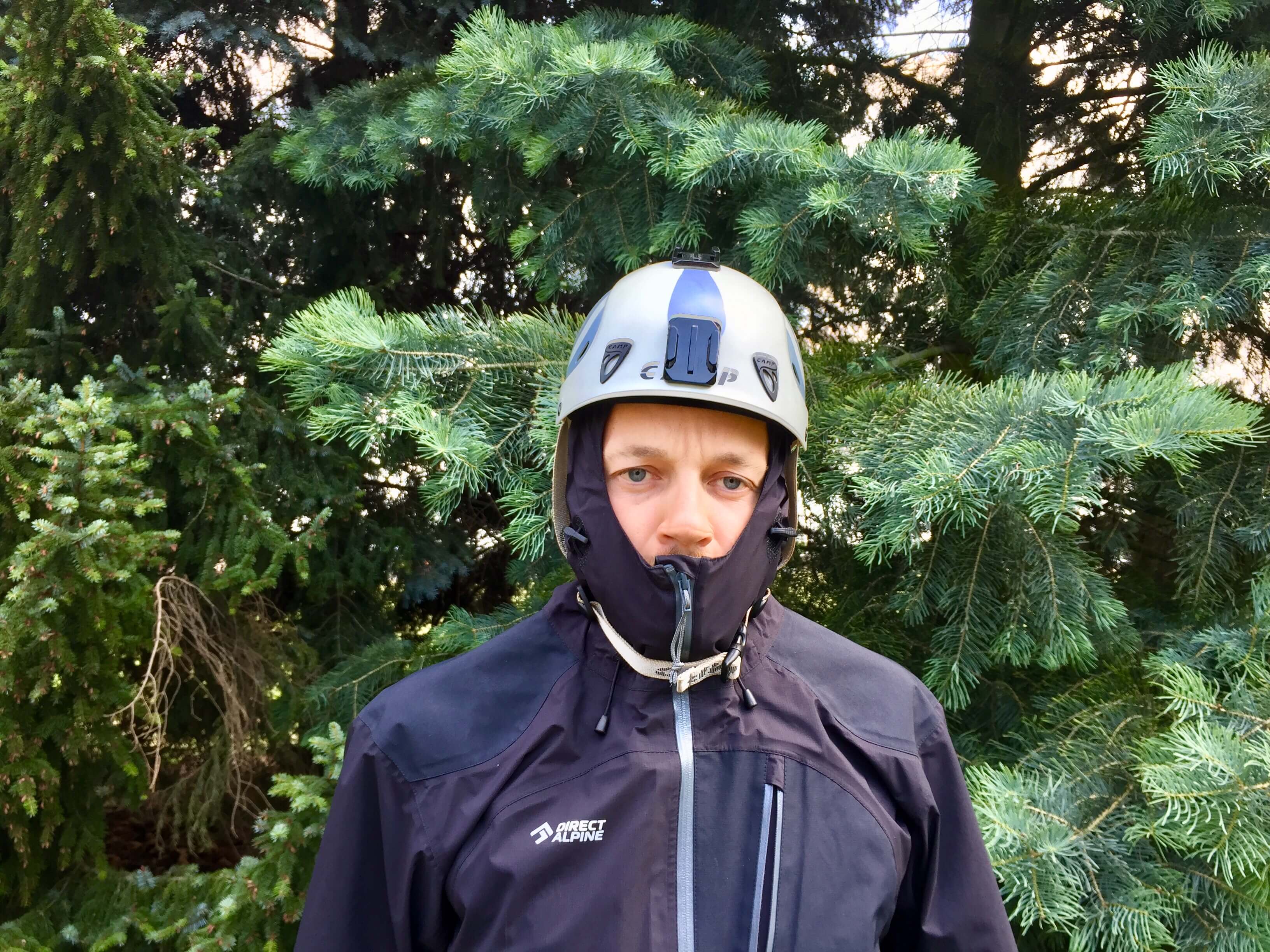 Helma přes kapuci bundy Directalpine Talung je jedno z rešení.