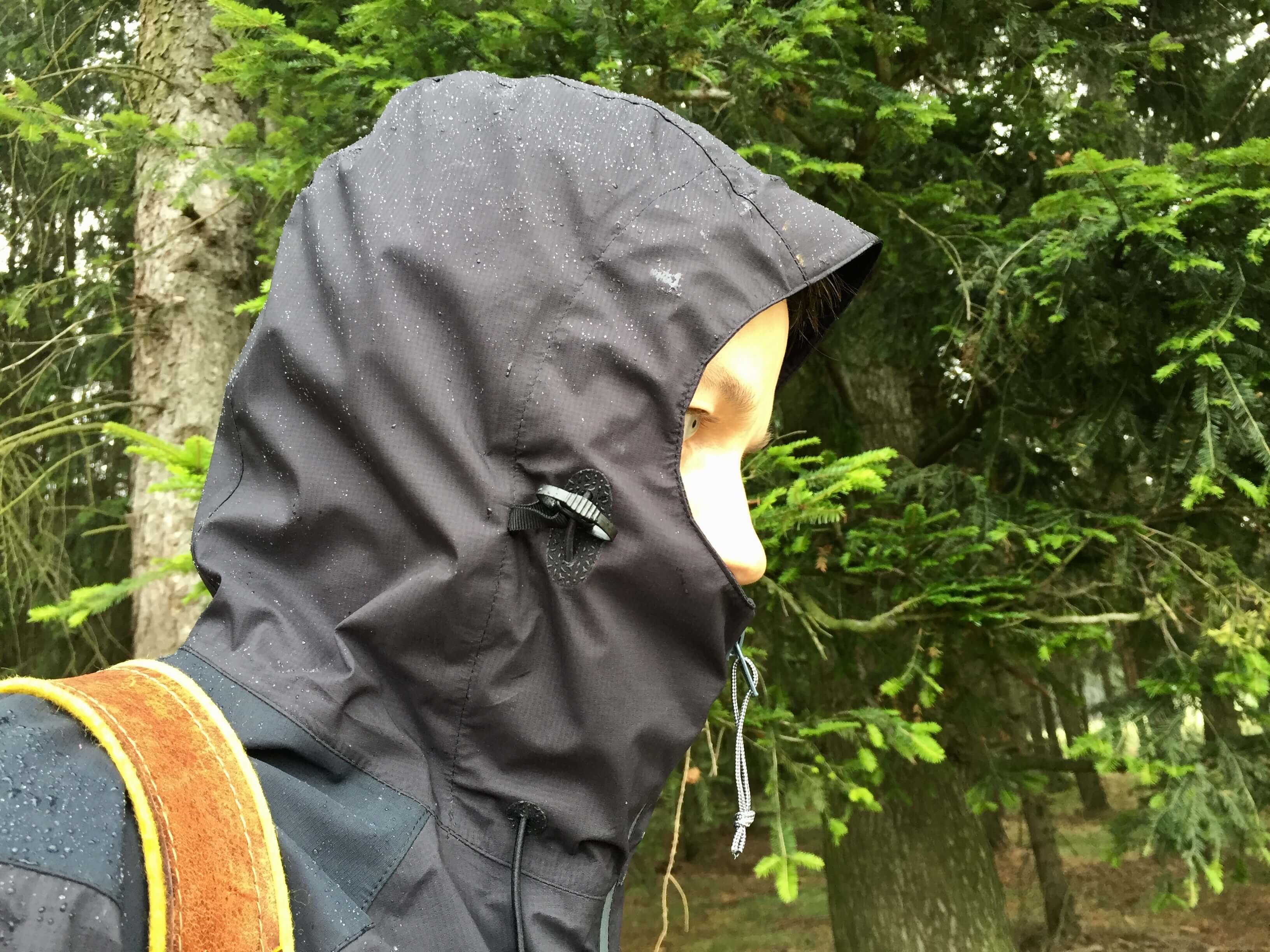 Nasazení kapuce se zapnutým zipem není možné, stejně tak si kapuci nesundáte, pokud nerozepnete zip. Když je kapuce nasazená, její spodní okraj dosahuje pod nos a obecně velmi dobře kryje obličej (relativně malý otvor). Léga pod zipem chrání tvář. Pozici kapuce se jednoduše nastaví pomocí dvou zdrhovadel v oblasti tváří, výhled chrání mírně vyztužený kšilt. Gumičky zdrhovadel jsou vedeny vnitřkem bundy mezi dvěma vrstvami látky, tudíž gumička nikde nezavazí a při větru vás nijak neohrožuje ve tváři. Dvojitá látka v oblasti brady se hodí také jako ochrana materiálu např. před vousy nebo krémem na obličej.