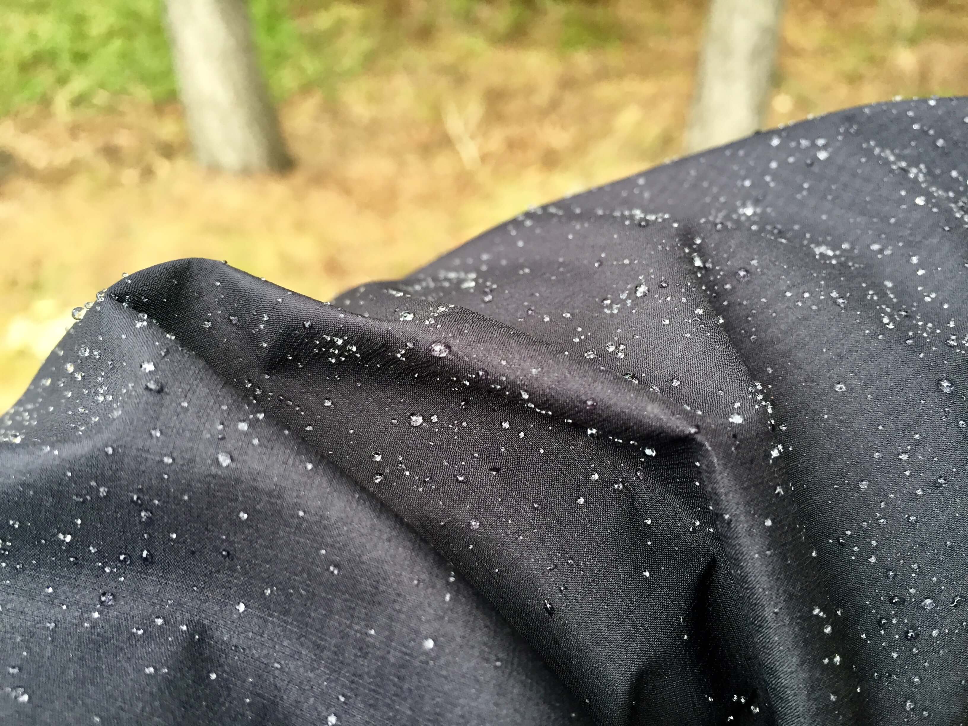 Nepromokavost bundy jako takové je absolutně dostatečná. Byla testovaná i ve velmi hustém dešti a kromě kapek skrz průzor kapuce se voda dovnitř nedostala. Situace se mění při fyzické zátěži nebo s batohem. Vlastně ani pořádně nedokážu určit, jestli voda prošla skrz bundu nebo jde o pot zevnitř. Důležité ale je, že studená voda a vítr přes látku neprochází. Vždy si mokré vrstvy postupně vyhřeji a když je prostor, okamžitě se převlékám. V případě letních přeháněk mě překvapilo, jak rychle bunda na těle schne. Po cca 10 minutové vydatné přeháňce trvalo bundě opět asi 10 minut než byla látka suchá (teplota cca 25 °C).