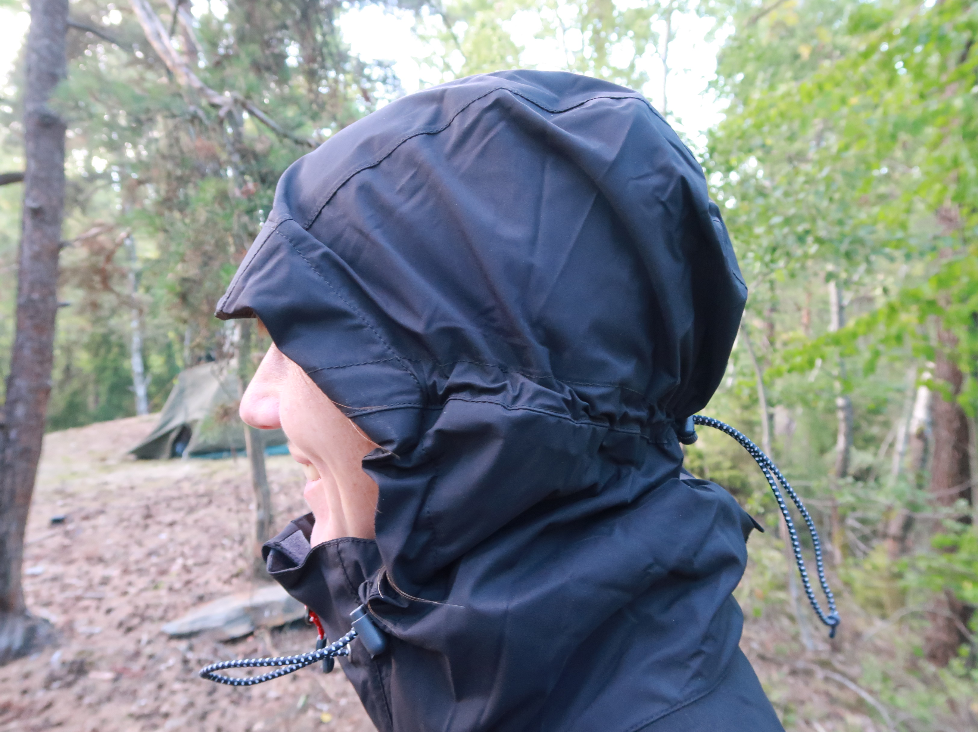 Kapuce sice není odepínací nebo složená do límce (, který je z příjemného materiálu a tak vysoký, že brání nachlazení krku) lze jí ale stáhnout ve dvou směrech a tak minimalizovat její velikost. Je schopná skrýt nejen hlavu, ale i menší lyžařskou nebo jinou přilbu. Navíc je vpředu vybavena štítkem, takže voda nestéká do obličeje.