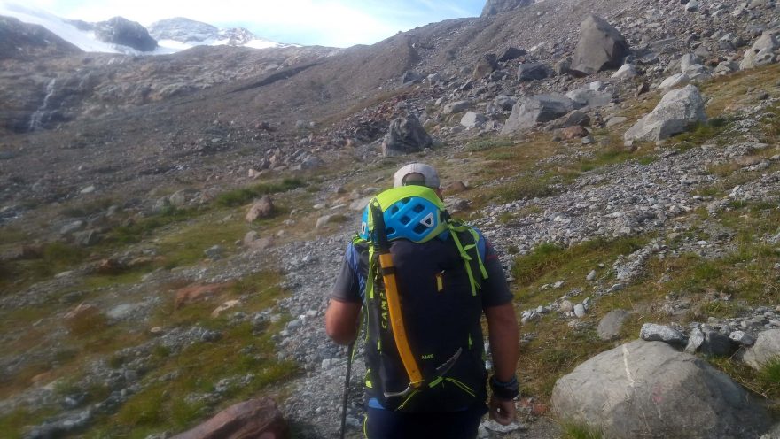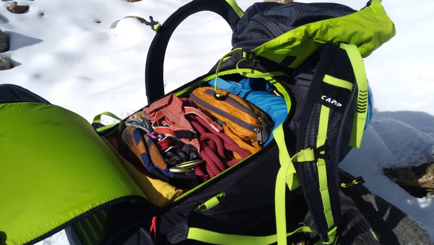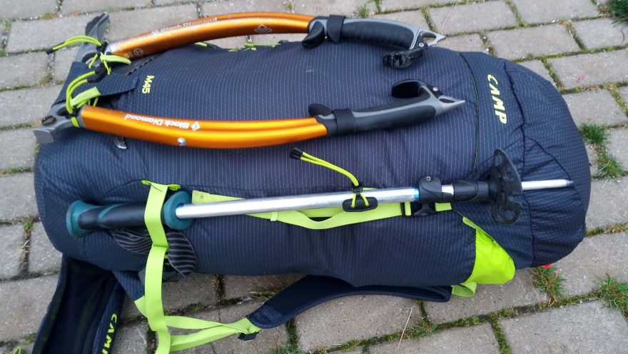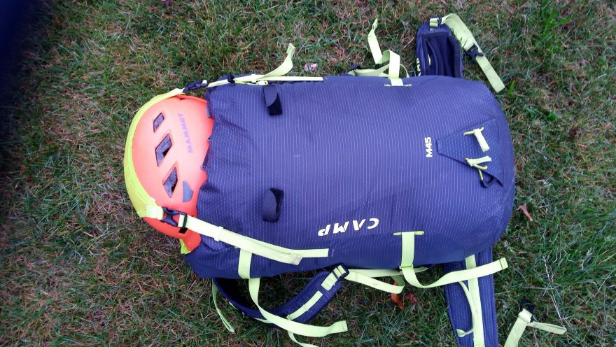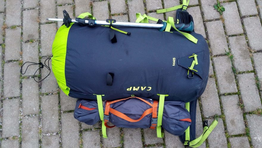 Batoh CAMP M45 je větší bráška od M30, který má též zadní vstup a stejné vychytávky. S hmotností 1300 g a objemu 45 l patří CAMP M45 do kategorie lehčích lezeckých batohů. Odlehčit je možno ještě odepnutím víka, případně bederního pásu. Materiál Nylon Ripstop se zatím jeví jako dostatečně pevný a odolný. A objem 45 se letos v Alpách osvědčil, protože bylo nutno na chaty nosit spacák a povlak na polštář, takže nám objem vybavení mírně nakynul.