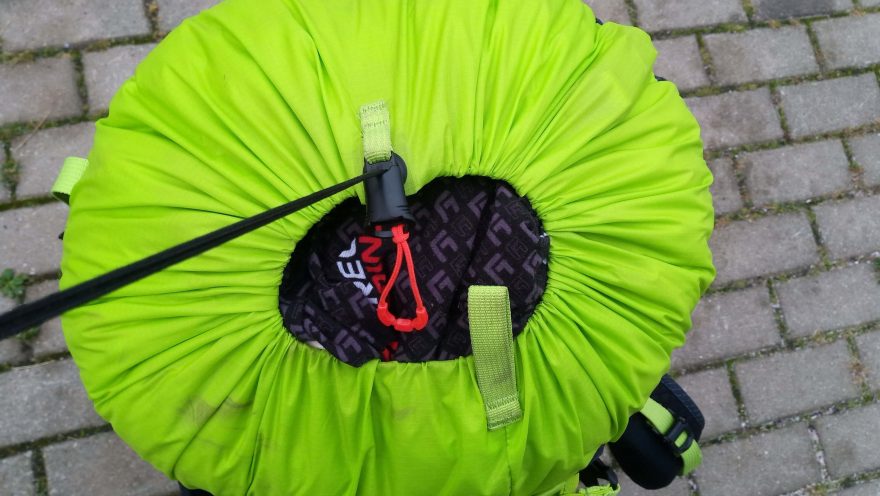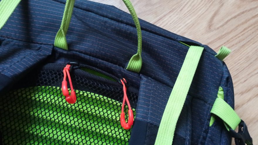 Dále je možno vstup zajistit extra víkem (držákem na helmu), který je v případě potřeby uschován v malé zipové kapsičce. Uvnitř batohu ještě naleznete pár síťovaných kapes na bocích batohu v horní části. Tam jsem většinou odkládal čepici, tyčinky nebo rukavice.