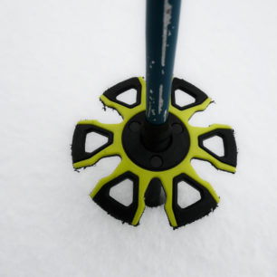 Talířek má v průměru 10 cm a je výklopný. Jedná se o kulový kloub a talířek se tak přizpůsobuje terénu. To je zvláště vhodné při stoupání po sjezdovce nebo na tvrdém povrchu a talířek se tak pokládá na povrch a nevyhazuje tak hrot ze sněhu. Talířek je tužší a myslím si, že by mohl vydržet i velkou zátěž. Během testování a několika desítek dnů v terénu bez poškození nebo známek opotřebení.