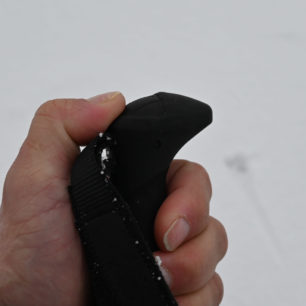 Hlavice madla sedne pěkně do ruky a poskytuje podporu či oporu i při chycení se shora. Materiál je neklouzavý a dobře se drží. V hlavici je i mechanismus a uchycení poutka. Jako horský vůdce oceňuji i možnost ovládat hlavicí vázání tak, že se nemusím ohýbat k páce na špičce vázání a k podložkám pod patou při stoupání. Vše v pohodě jsem zvládal ovládat touto hlavicí madla hole.