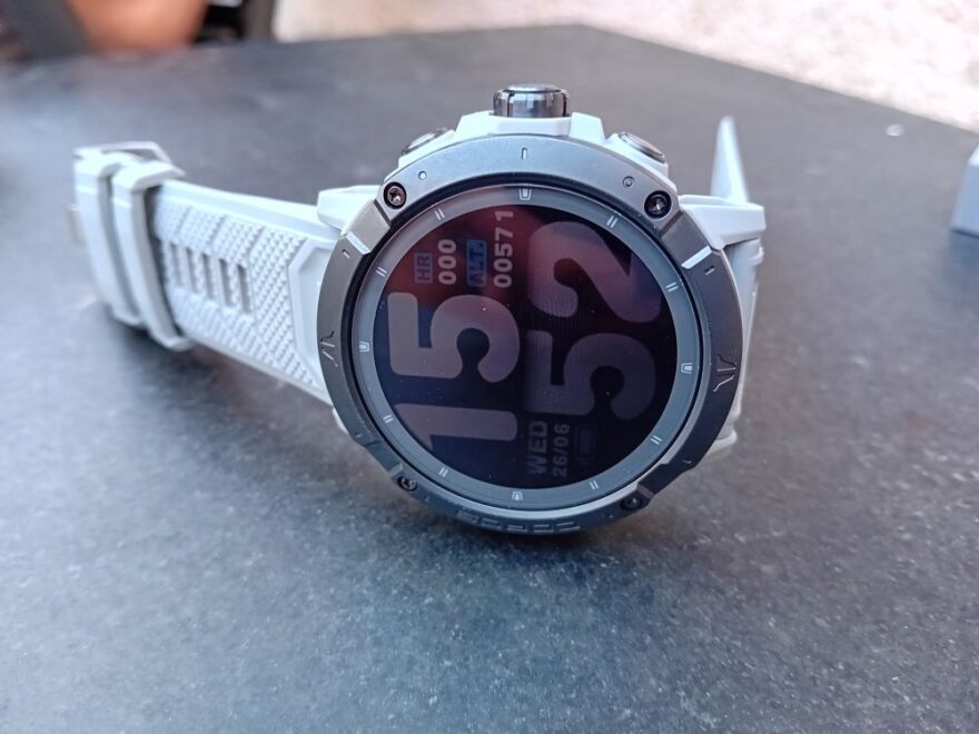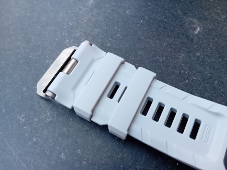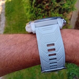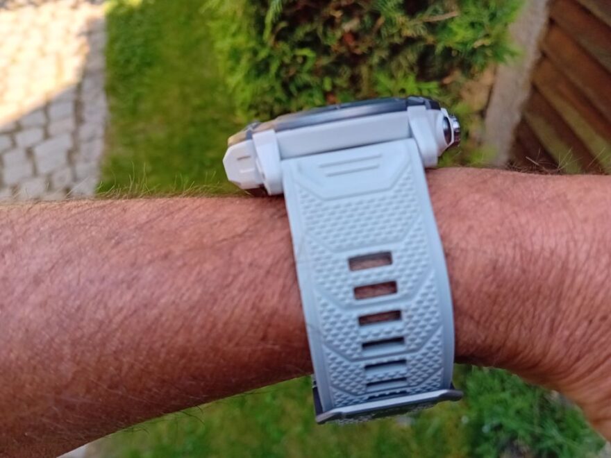 Hodinky na ruce působí neskutečně lehce a pocitově je tak nošení velmi příjemné. Díky extra širokému řemínku drží hodinky na ruce jako přibité, to samozřejmě pozitivně ovlivňuje měření srdeční frekvence optickým sensorem, u takto robustních hodinek zpravidla méně přesné hodnoty zde téměř kopírují záznam z hrudního pásu. V balení naleznete hned dva řemínky. Standardní silikonový při šířce 26 mm výrazným způsobem přispívá právě k pocitově velmi příjemné nositelnosti. Dokonale usadí tělo hodinek na zápěstí, k nepříjemným pohybům nedochází v rámci testování ani na horském kole v náročnějším terénu. Spona řemínku je poměrně těsná s ohledem na šířku řemínku a jeho provlékání tak trochu „drhne“. O to lépe pak ale drží na svém místě. Daní za parádní usazení je pocitově vyšší pocení pod takto široký páskem, výraznější perforování by mu tak z našeho pohledu rozhodně slušelo a zřejmě ani neubralo na funkčnosti.