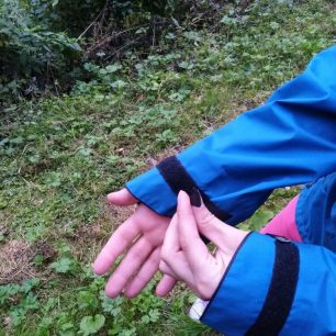 Rukávy jsou šité tak, že přes hřbet ruky je látka delší a do oblouku, zato u dlaní je krátká. To se mi zdá výhodné při držení se zábradlí, nebo při držení turistických hůlek. Rukávy jsou zakončené suchými zipy pro nastavení vhodného obvodu. Rukávy jsou dost široké, aby se tam vešla i spodní vrstva. Tato bunda je turistická, tím jen chci říct, že pod kapuci se nevejde helma. Ani lezecká, ani cyklistická. Zkoušela jsem to. Tak jako rukávy i spodní obvod bundy je zakončen pevnou tvrdší látkou. Touto látkou prochází gumičky na stahování. Ano, i spodní lem bundy je stahovací.