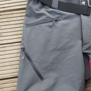 Novinkou tohoto modelu je inovovaný pásek. Výrobce využívá již osvědčený způsob zapínání na kovovou sponu. Pásek však rozšířil a stejně jako celé kalhoty tím cílí na univerzálnost. Pásek se dá snadno využít i v dalších kalhotách schovaných v šatníku, které mívají v pase širší oka na uchycení. Cascade Top jsou vybaveny čtyřmi kapsami. Jsou jimi klasické dvě kapsy v horní části stehen, mají vodorovný vstup, který je lze zavřít na zip. Šikmo přes pravé stehno je další zipem uzavíratelný vstup do kapsy, která se mi osvědčila na nošení telefonu. Je trochu prostornější než dvě dříve zmíněné. Trio těchto kapes doplňuje jedna skrytá, malá kapsička v zadní části. Schová i ta nejtajnější milostná psaníčka.
