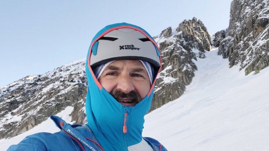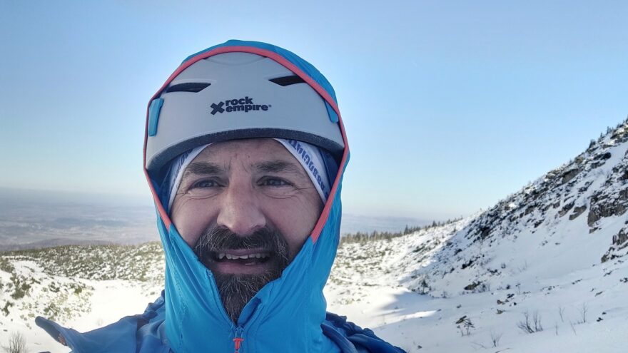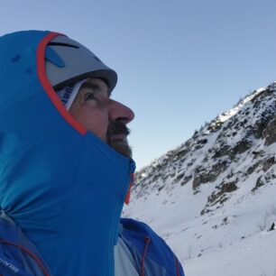 První, čeho si na bundě všimnete, je precizní ergonomický střih. Sedí výborně na těle a neomezuje v žádném směru pohybu, ať už lezete, běžíte nebo stoupáte na skialpech. Anatomicky tvarovaná kapuce je dostatečně přiléhavá, takže ji bez problémů nasadíte i pod přilbu. Díky materiálu se dá i natáhnout přes lezeckou přilbu.