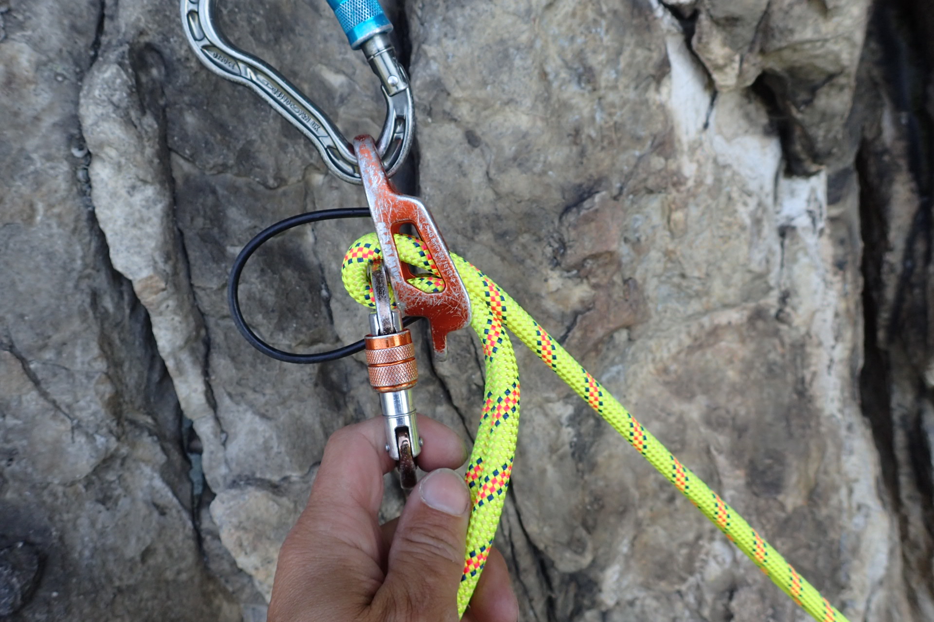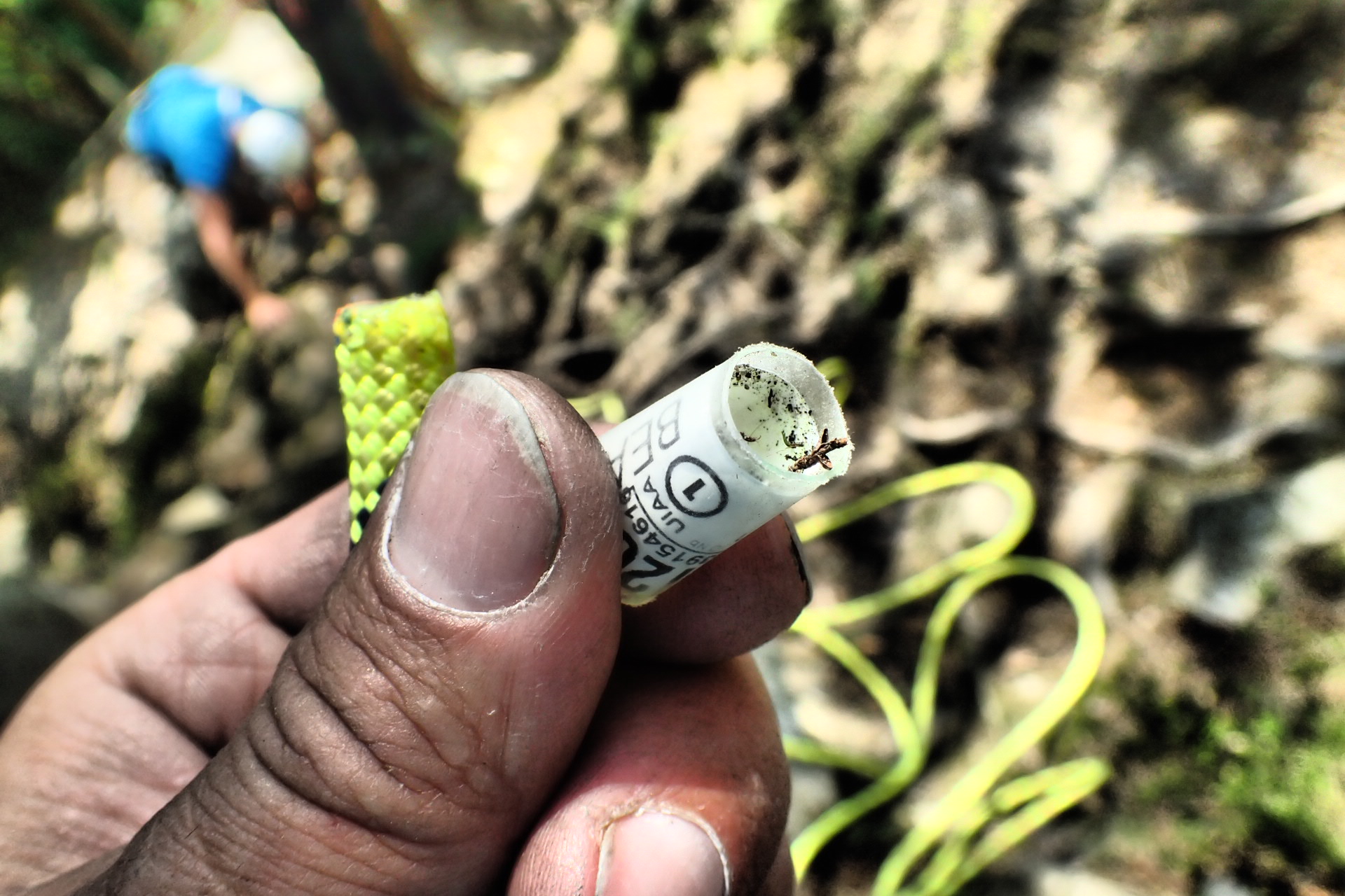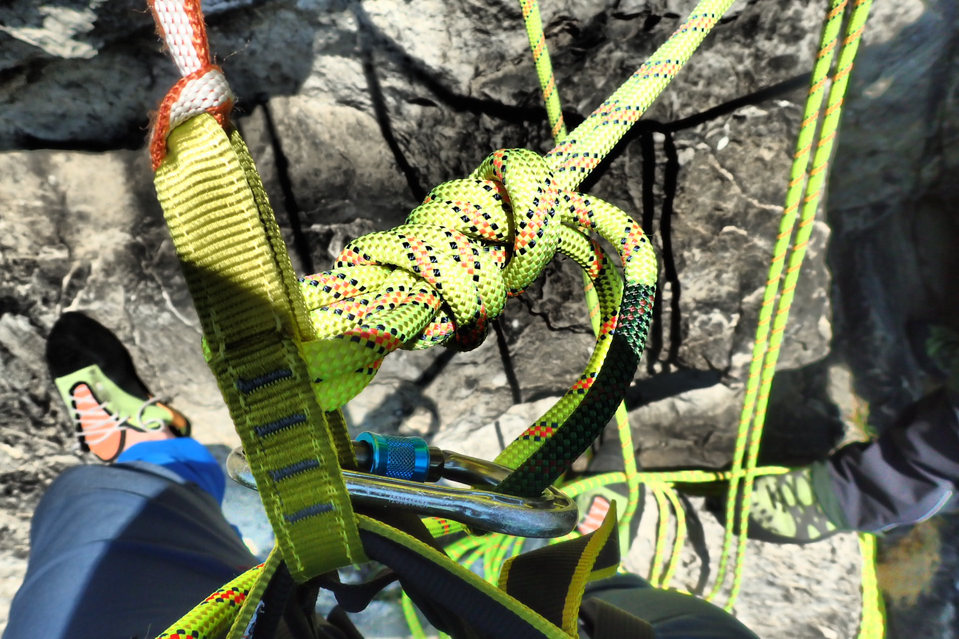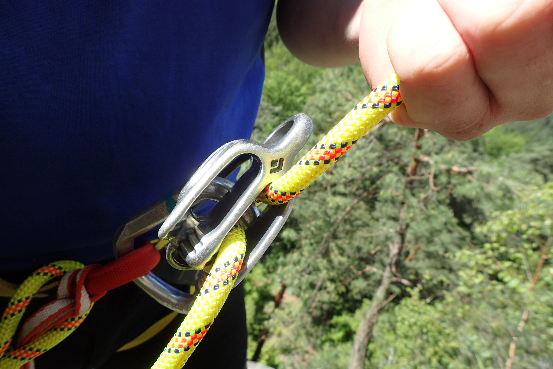 Příjemná práce s lanem Karma 9,8 v dalším typu kyblíku při jištění prvolezce.