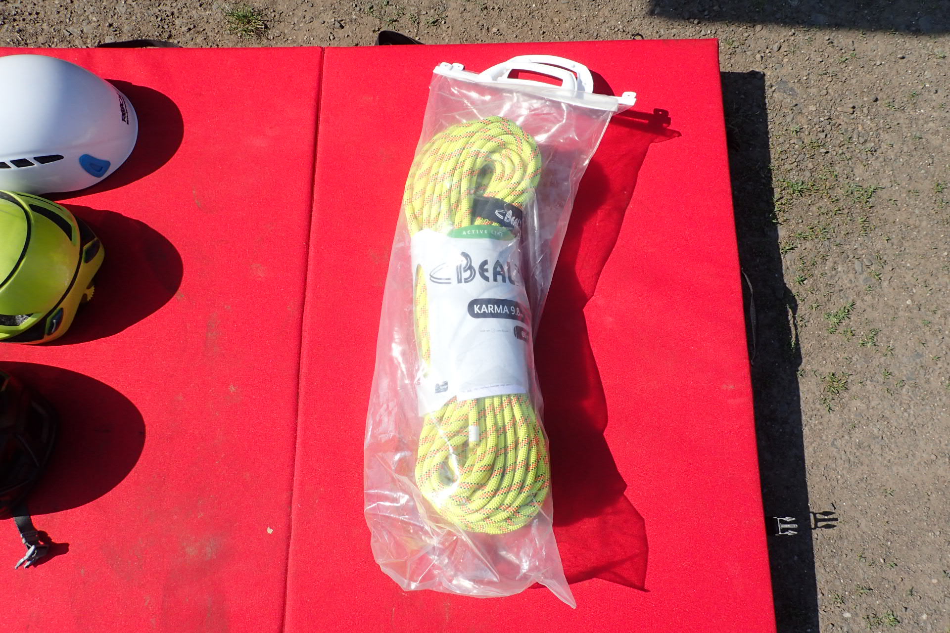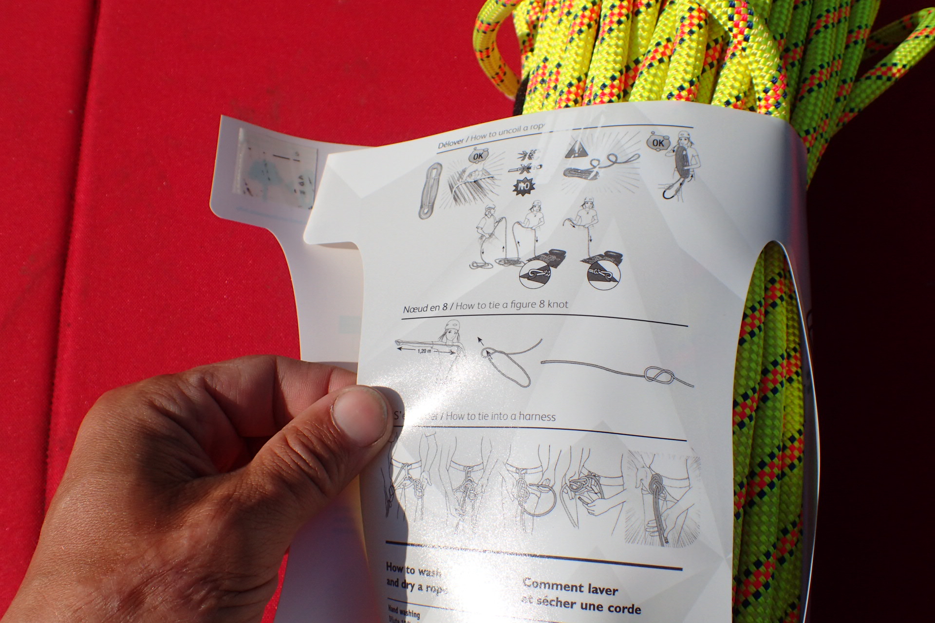 Jak rozbalit lano a navázat se je součástí plastového přebalu lana BEAL Karma 9,8.