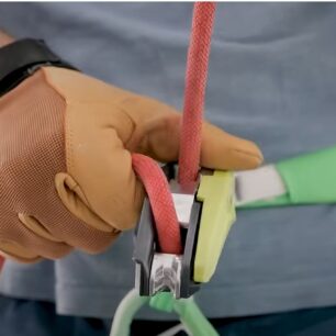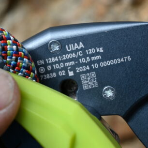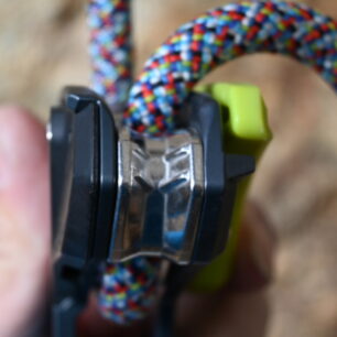 Lano se do jistítka vkládá jednoduše vyklopením bočnice. Ta je proti samovolnému otevření zajištěna a k otevření je nutné stisknout boční pojistku. Ta je při nedovření označena červenou barvou, která by vás měla upozornit, že bočnice není dovřená. Vše se dá naučit i jednou rukou – třeba je cvik (takový jako při otevření Zippo zapalovače). Po otevření bočnice je vidět ocelová vačka – srdce jistítka. Vložení lana je označeno piktogramy. Lezec a jistič. Mě osobně se osvědčilo držet lano vedoucí k lezci a začít vkládáním z jeho strany. Pak to dokončit směrem k jistící ruce. Ano. Podařilo se mi to založit i mimo určené místo pro vložení lana. To je třeba si pohlídat. Pak už stačí vrátit bočnici sklopit zpět a připojit k jistícímu oku úvazku šroubovací karabinou. Nebo i jinak?