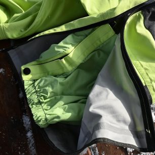 Materiál sám o sobě funguje skvěle a udýchá toho opravdu hodně. Avšak pro ještě větší termoregulaci, když chrtíte do kopce, jsou opatřeny celopropínacími nohavicemi. Takže jsou boky nohavic opatřeny dvojicí jezdců a vy tak můžete větrat, oblíknout nebo vysvléknout kalhoty bez nutnosti sundávat boty nebo dokonce lyže! Všechny použité zipy jsou voděodolné. Kromě zipu na poklopci. Díky nim je můžete takto snadno natáhnout přes boty i s lyžemi.