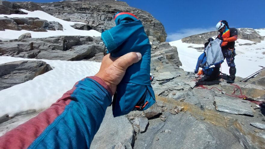 Jednoduchá, spíše turistická nebo cestovatelská bunda, která nezabere po sbalení moc místa a na těle udělá dobrou práci. Během testování odolala všem nástrahám hor a zvládla i pohyb po ledovci a několik výstupů na nejvyšší rakouskou horu. Nepromokla, neprofoukla a zvládla udýchat i chůzi a pohyb po ledovci a nástupy k němu. Umístění dvou hrudních kapes přes sebe bych u verze 2.0, která zcela jistě bude, vyřešil jinak a pak se na trhu objeví zcela nepochybně další štika v rybníce.
