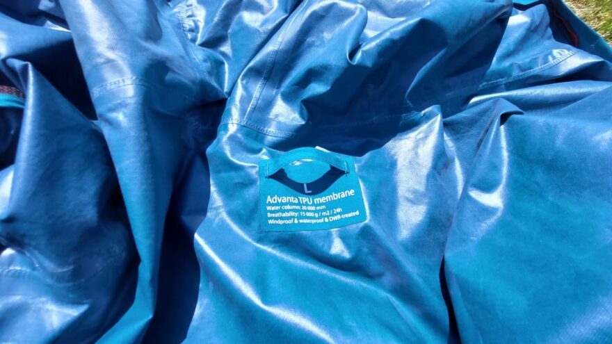 Výrobce na webu uvádí jako materiál pouze 100% Polyester s DWR úpravou, která během testování fungovala příkladně a parametry 20 000 mm vodního sloupce a 15 000 g/m2/24 prodyšnosti. Na bundě je však uveden název membrány Advanta TPU membrane. Voděodolnost byla několikrát prověřena během sněhových a deštových přeháněk na Grossglockner a to opakovaně během 6 výstupů na tuto horu. Dále byla otestována i prodyšnost, a to především na ledovcových túrách a při výstupech, které tato bunda zvládla udýchat. Vždy však s pomocí ventilace v podpaží. Tejpování švů se zdá provedeno kvalitně, a to 18mm páskou.