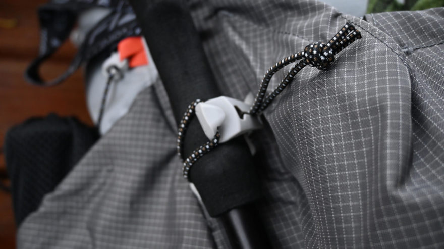 Hole je možno buď ukládat do bočních kapes nebo fixovat pomocí dvojice gumiček se samosvorkami a háčkem. Zvolená průměr gumy působí důvěryhodně a klidně jsem tomuto způsobu uložení holí důvěřovala.