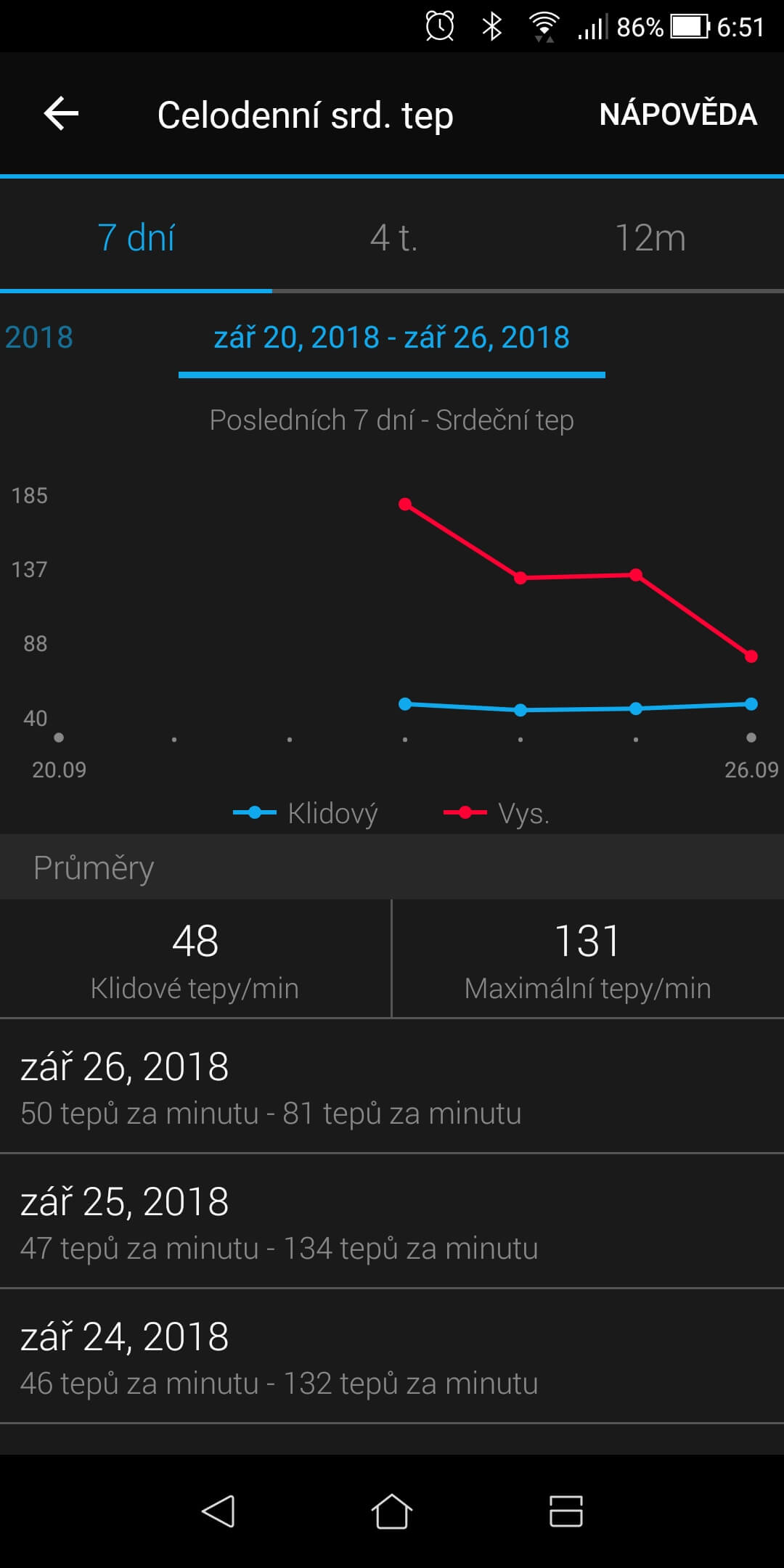 Celodenní sledování srdeční frekvence: Standardně se zobrazuji poslední 4 hodiny. Tato funkce je propojena i se zobrazováním Míry stresu.