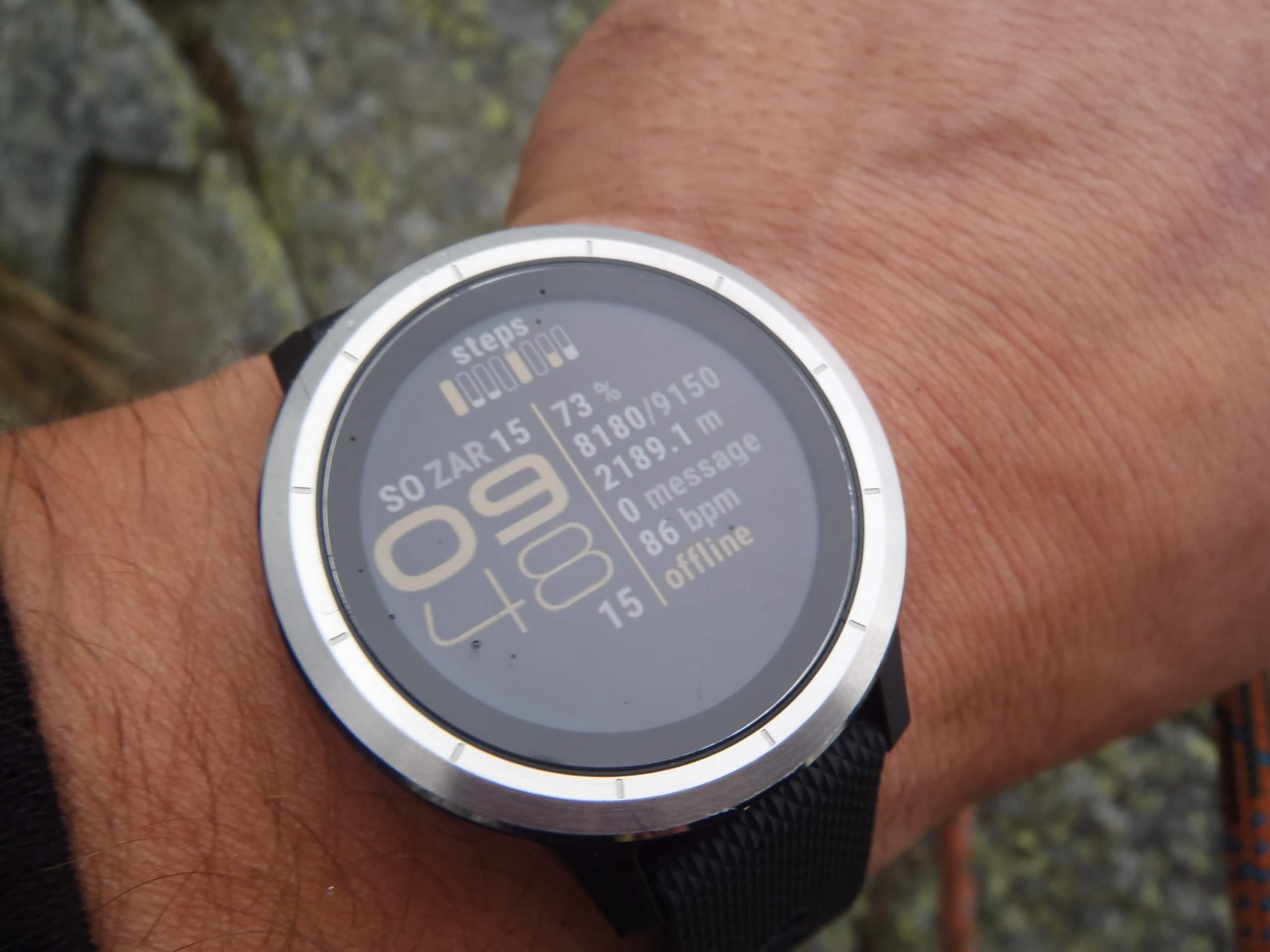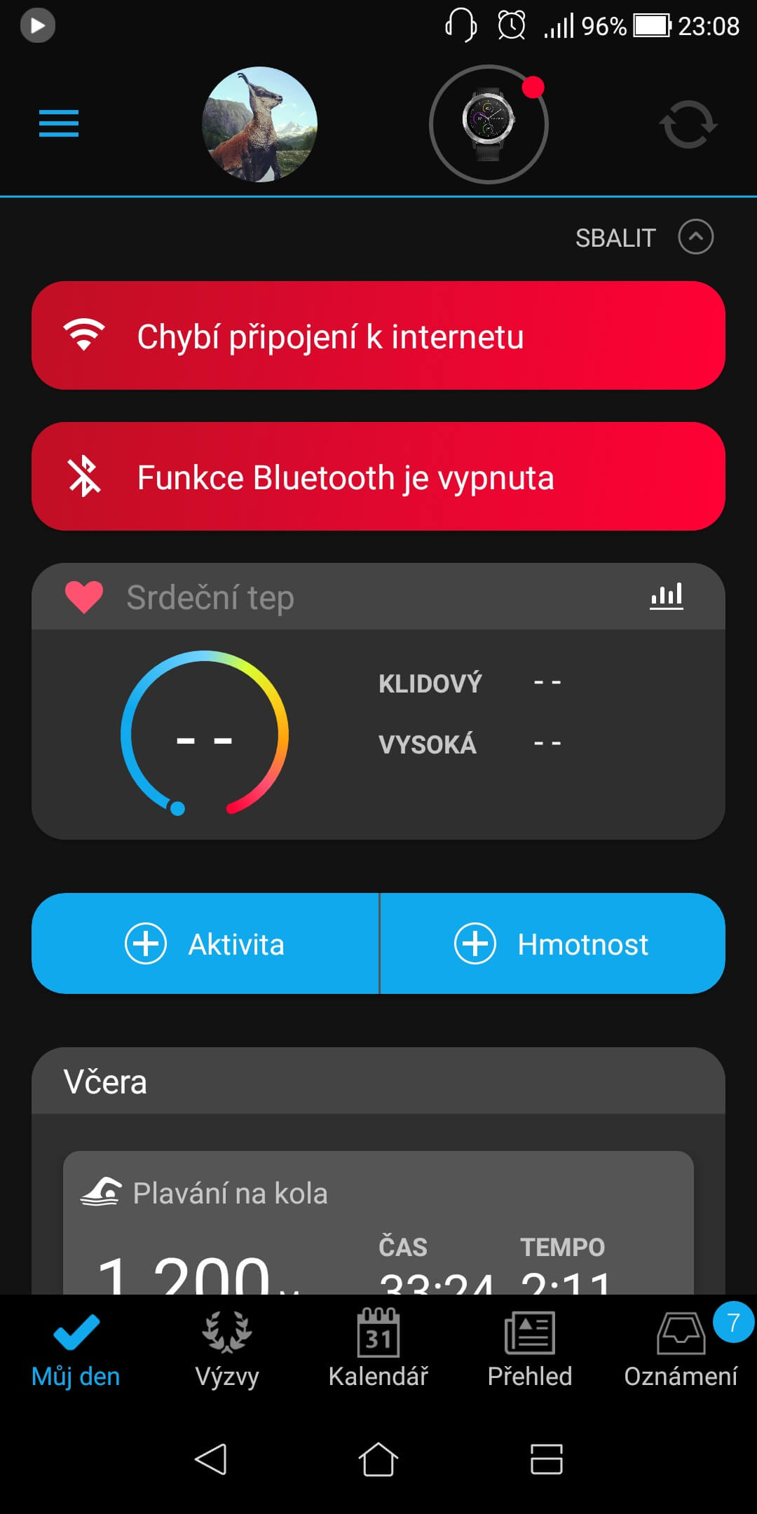 Základní obrazovku čili tu, kterou máte jako úvodní, si můžete buď měnit ze základního menu, které je uloženo v továrním nastavení hodinek. Další obrazovky, které vám více vyhovují pro vaši aktivitu nebo se vám zkrátka více líbí, si můžete stáhnout z Obchodu Connect IQ. Další obrazovky jsou například: počty kroků, Můj den, Poslední aktivita, Přehled hlášení, které vám přicházejí na mobil, Ovladač hudebního přehrávače, Tepová frekvence za poslední 4 hod., Nastoupané schody a Kalendář. V případě, že nejste propojeni s telefonem, tak po najetí na okno vás vykřičník na tento fakt upozorní, tzn., že údaje nemusí být aktuální. Důležité je si uvědomit fakt, že samotné hodinky bez připojení k telefonu na datech nebo WIFI je pouze poloviční nástroj. Výhodou však je, že vaši sportovní či denní aktivitu můžete provozovat bez připojení k telefonu. Vše se potom spáruje s telefonem až po připojení.