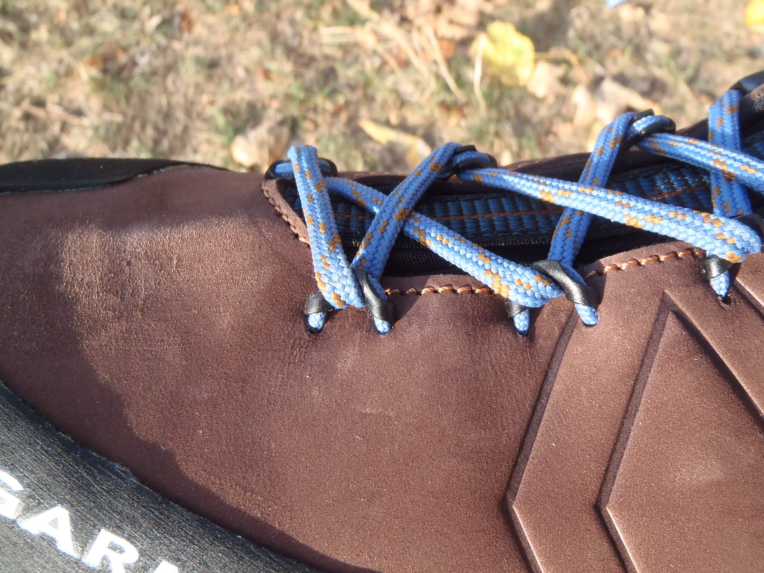 Tkaničky jsou kontrastní a ladí se zbytkem boty a drobnými detaily. Šněrování je poměrně do špičky, takže je možno botu řádně zatáhnout. Tkanička je od špice provlečena třemi páry plastových kladek, takže chodí volně a dobře se zatahuje. Pak následuje zasekávací háček, který drží tkaničku na svém místě a ta neprojíždí. Je tedy možno nezávisle zatáhnout nárt a kotník. Po prvním páru těchto háčků následuje textilní poutko respektive popruh, který fixuje patu. Tento popruh je protažený po obou stranách k patě a lépe ji fixuje. Nad tímto tzv. HEEL LOCKEM následují další dva páry háčků.